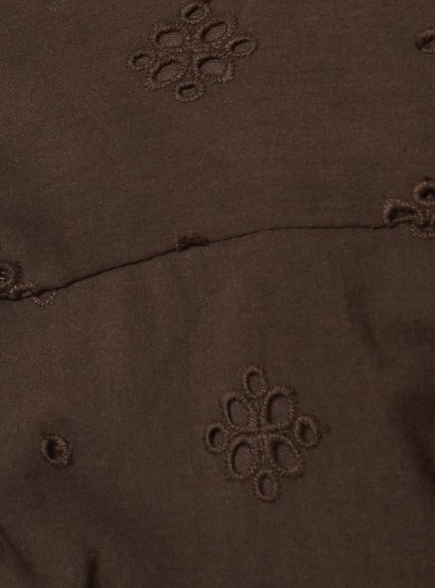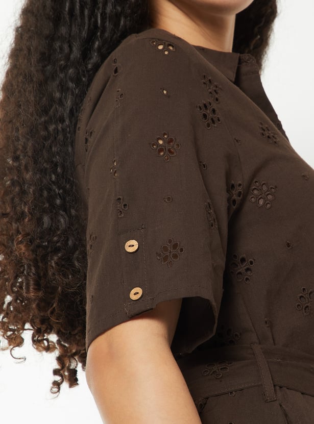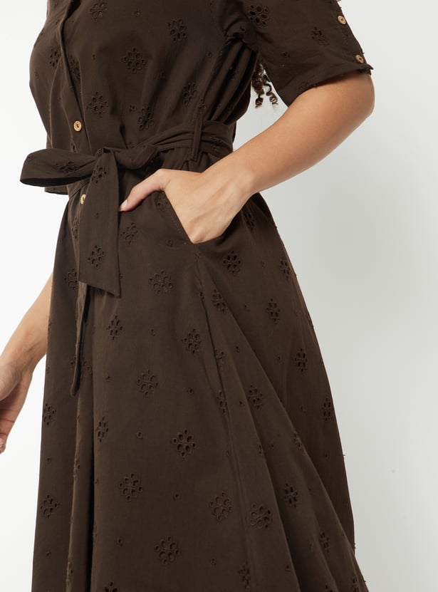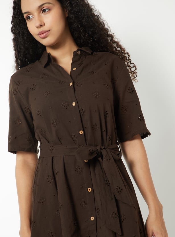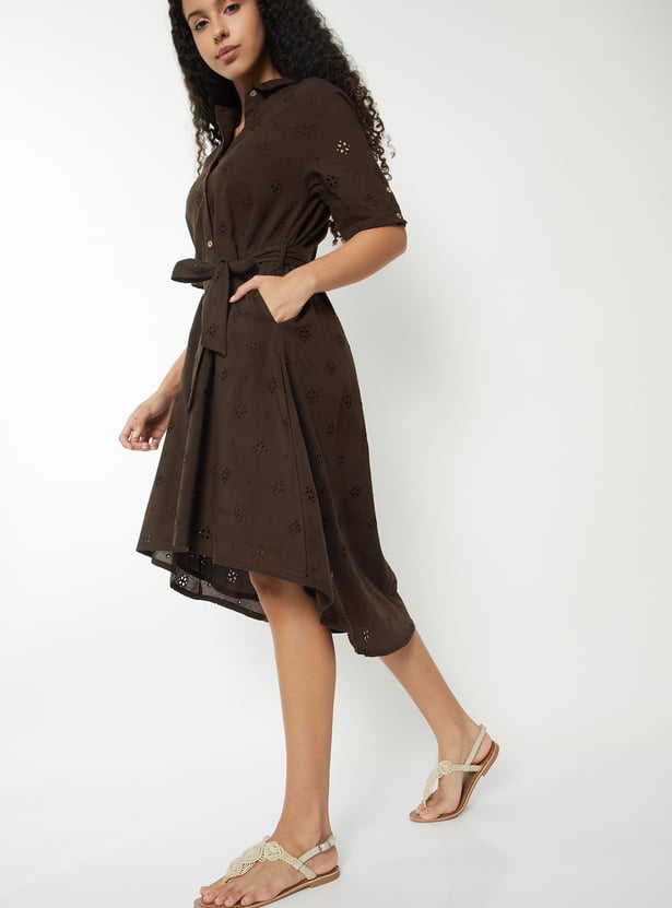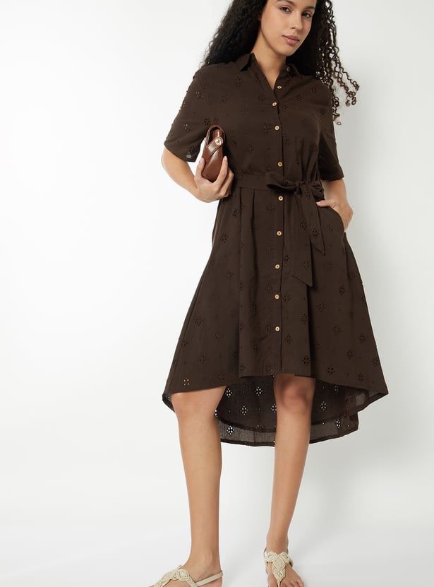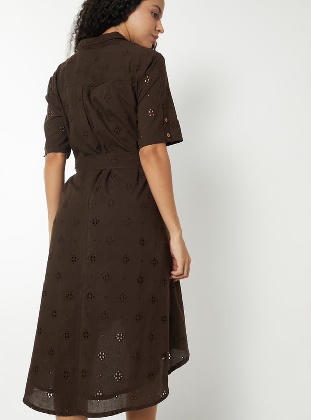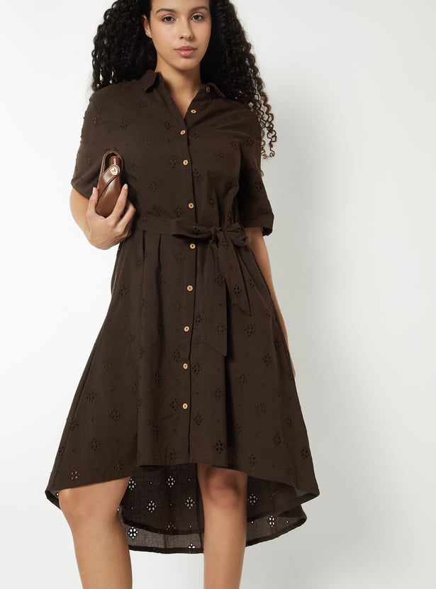 Women Solid Schiffli High-Low Belted Shirt Dress