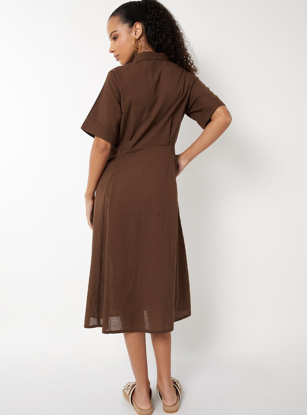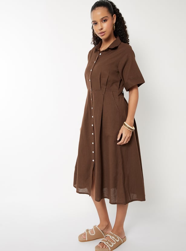Make a statement in this solid shirt midi dress, featuring a spread collar, button placket, and half sleeves. Pleated detailing and side pockets add both structure and practicality to this effortlessly chic silhouette.