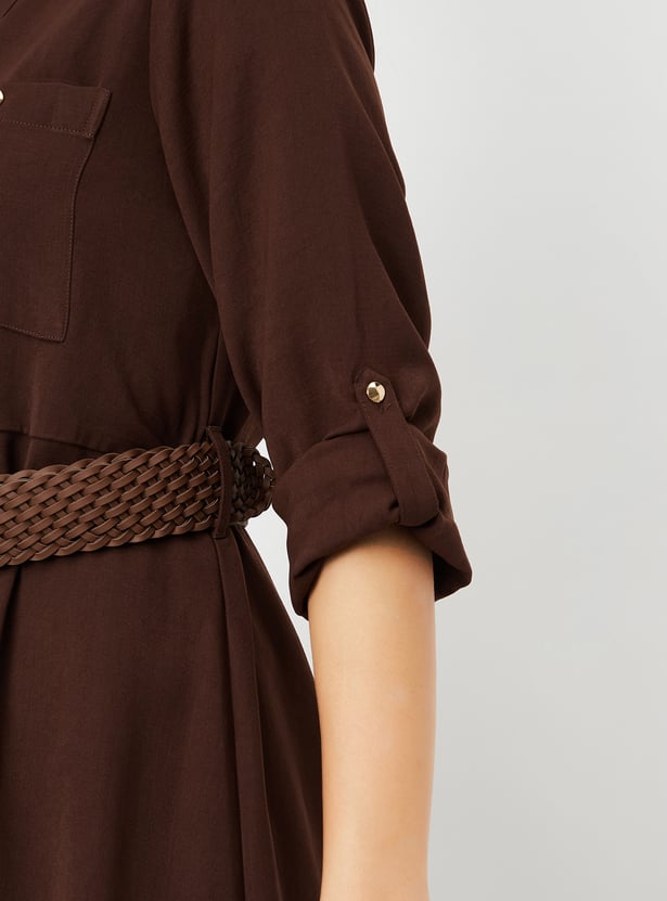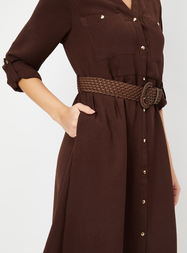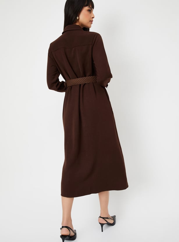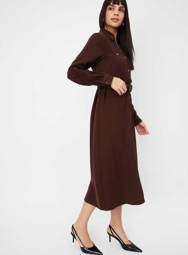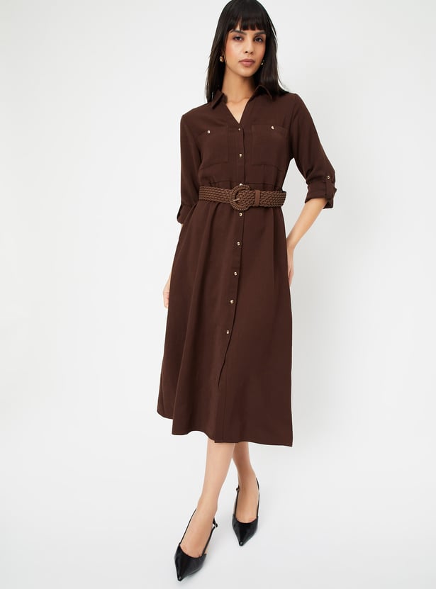 Chic and versatile, this solid shirt midi dress with belt is a timeless wardrobe staple. Featuring a button closure and full sleeves with button cuffs, it blends classic structure with everyday elegance. Model Size :