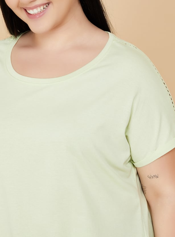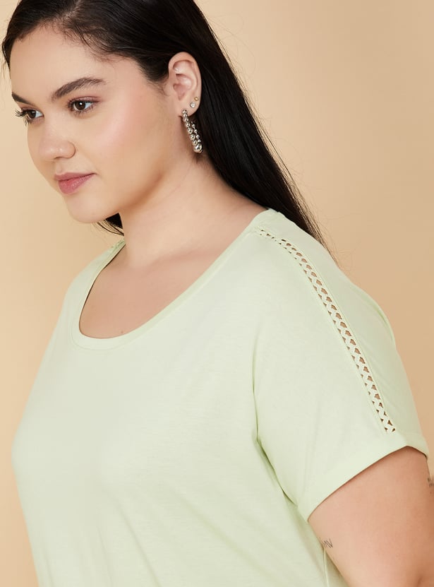 Elevate your everyday style with this beautifully crafted solid t-shirt. Featuring delicate lace inserts on the shoulders, it’s the perfect balance of sophistication and comfort for any occasion. Model Size :