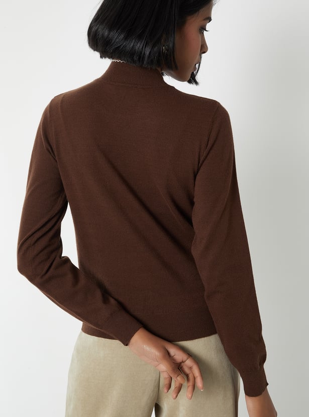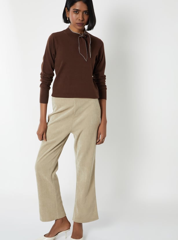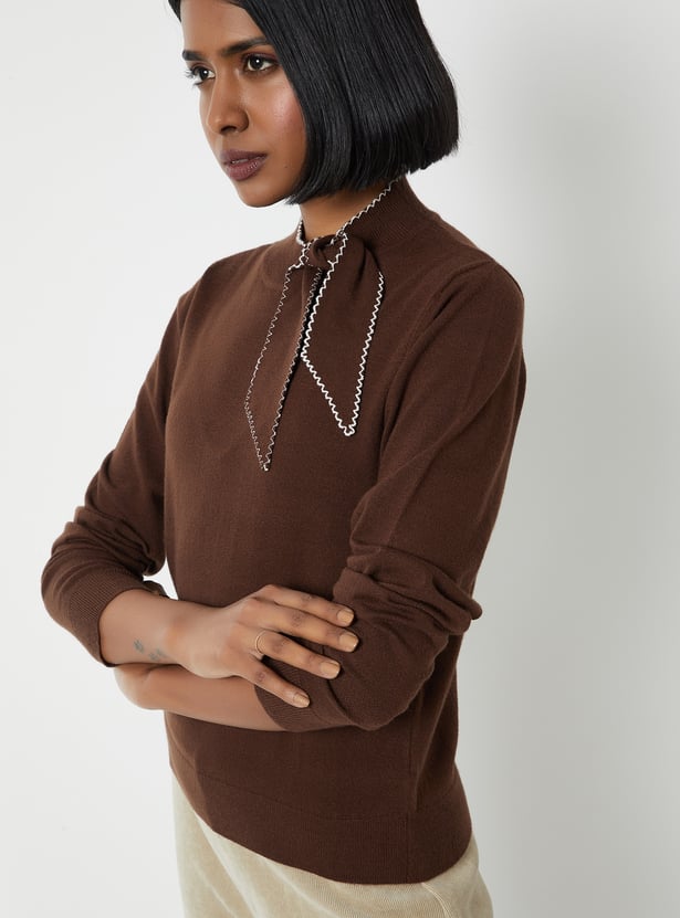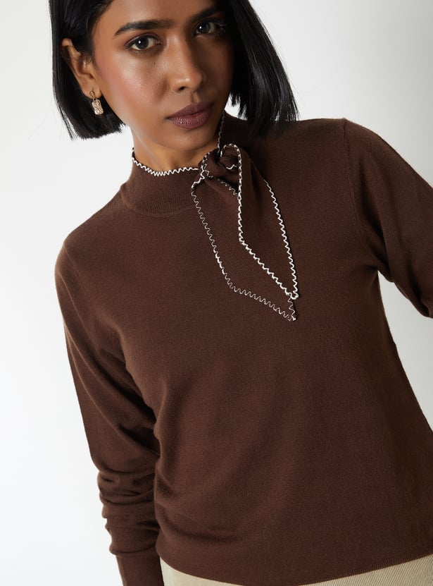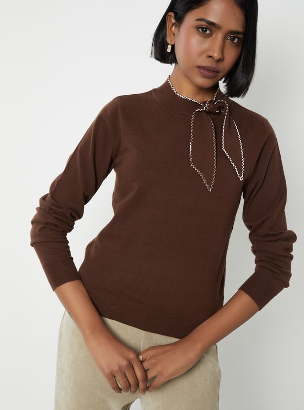 This top with tie-up detail features a charming tie-up neck and full sleeves, adding a feminine touch to your everyday style. The elegant design makes it perfect for both work and casual outings.