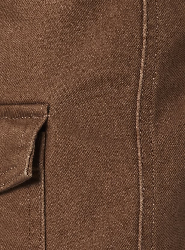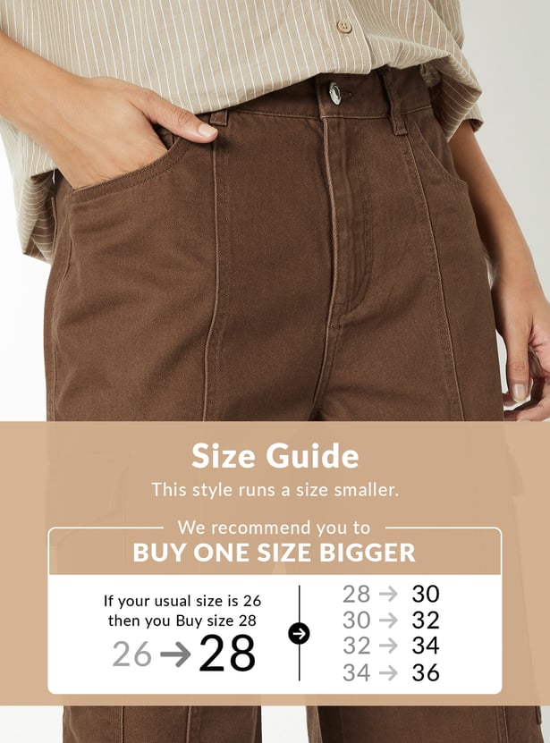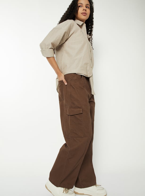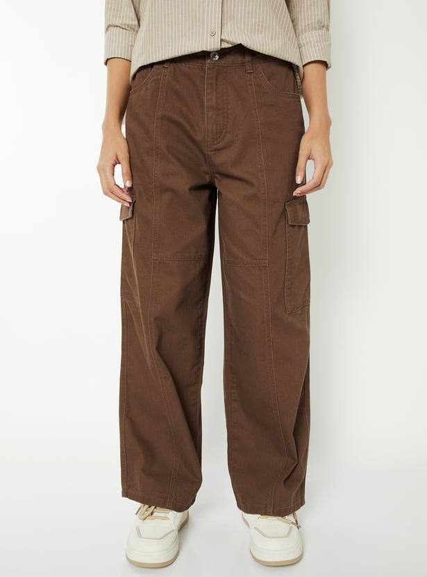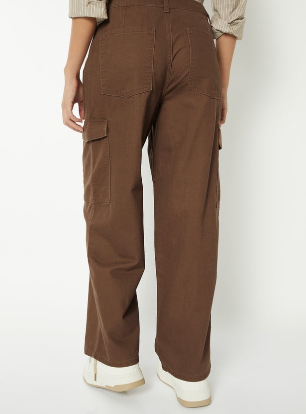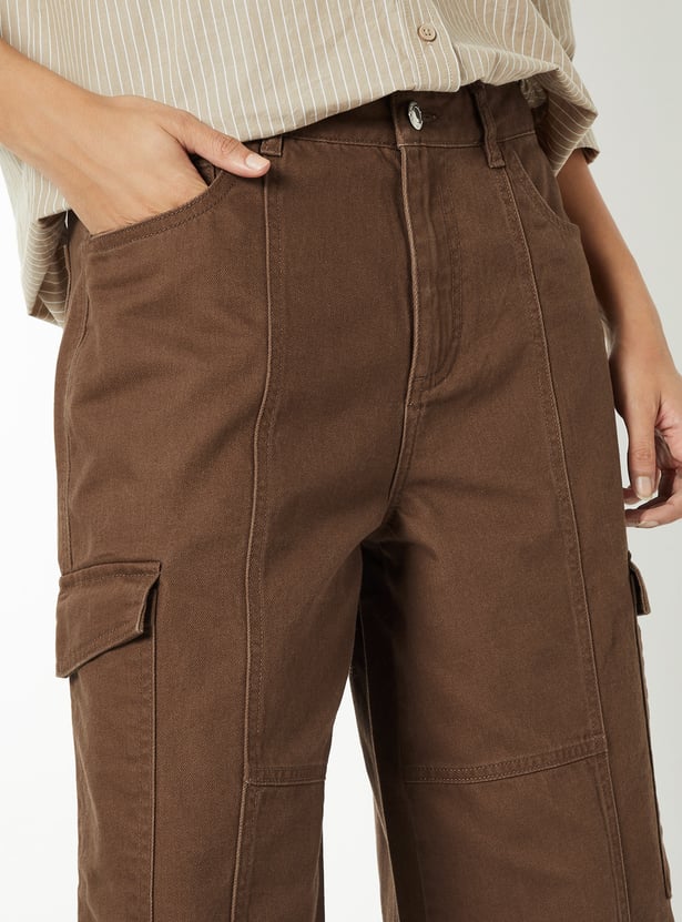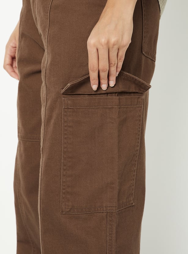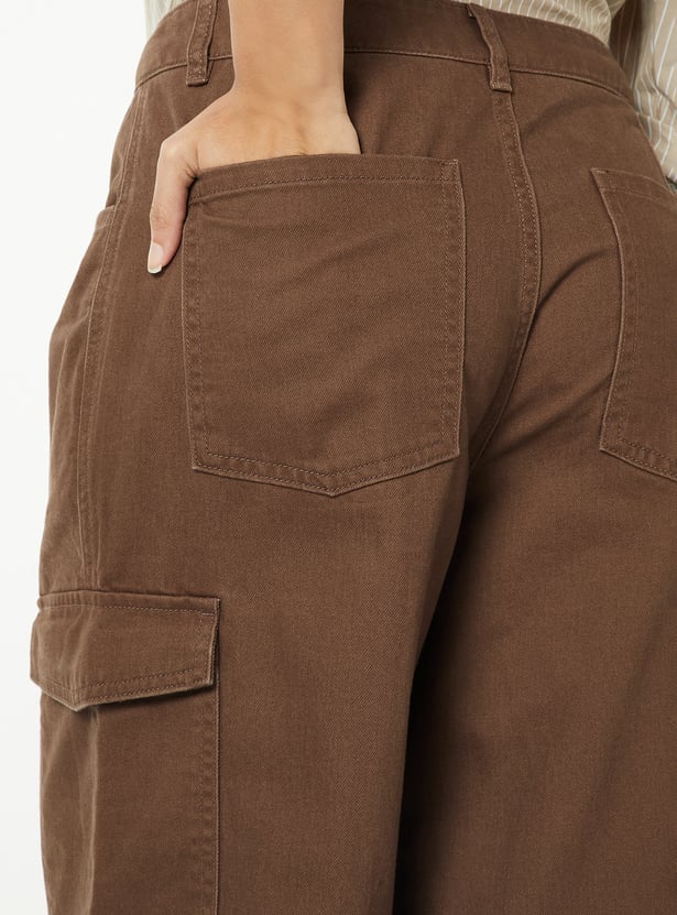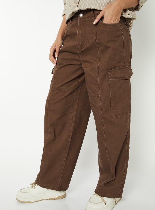 Women Solid Wide Leg High-Rise Cargo Jeans