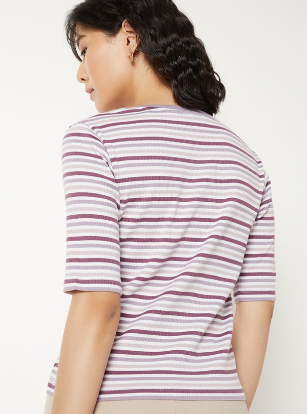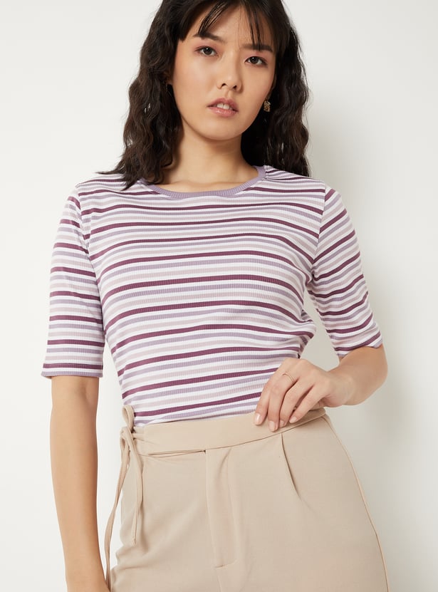 This striped knit T-shirt features a classic round neck and half sleeves with timeless stripe detailing for a casual, chic look. Its comfortable fit makes it perfect for everyday wear. Model Size :