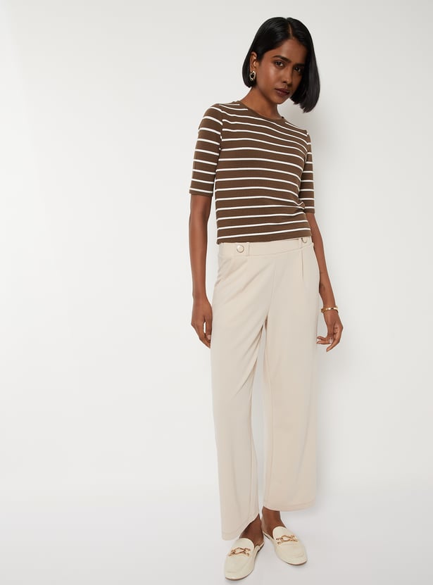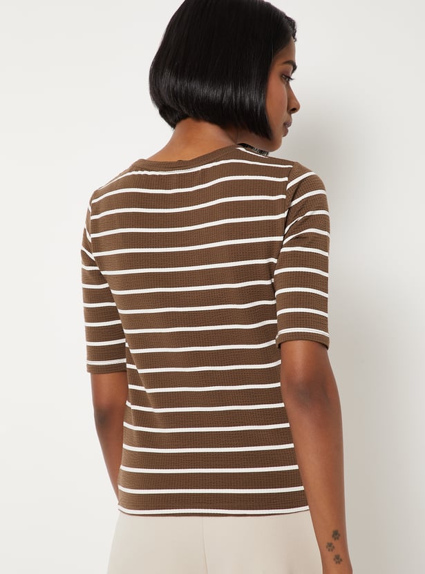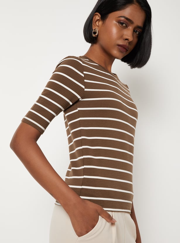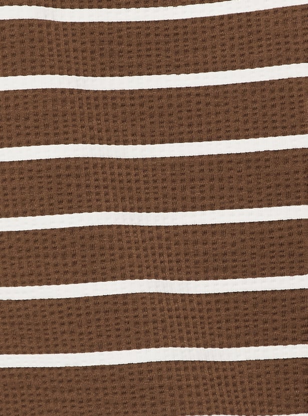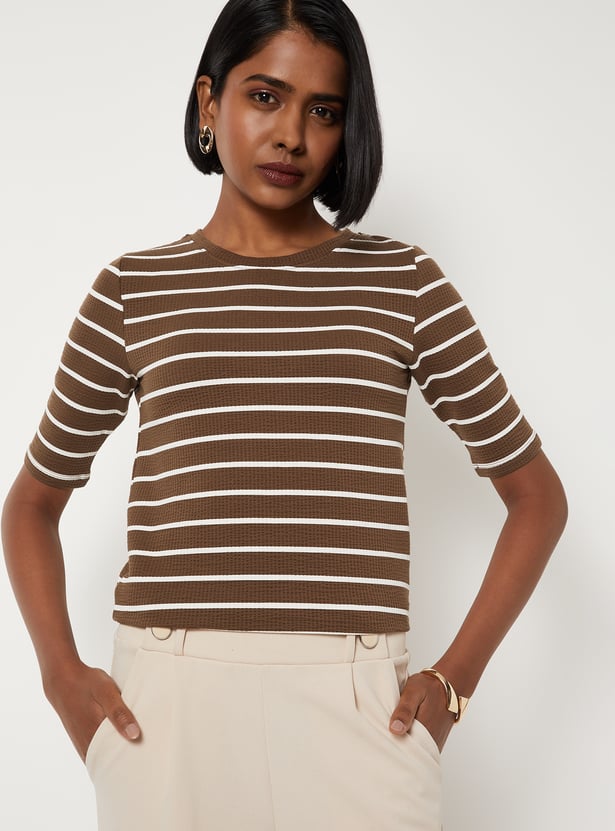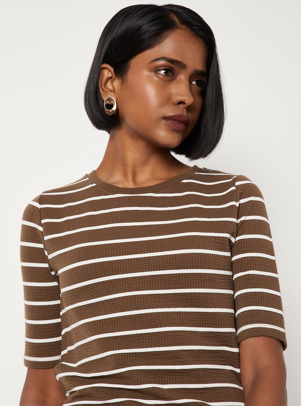 Refresh your casual wardrobe with this striped T-shirt, featuring a soft round neck and half sleeves for relaxed comfort. The timeless stripe pattern adds a touch of effortless style—perfect for coffee runs, weekend strolls, or layering under a jacket for a chic twist. Model Size :
