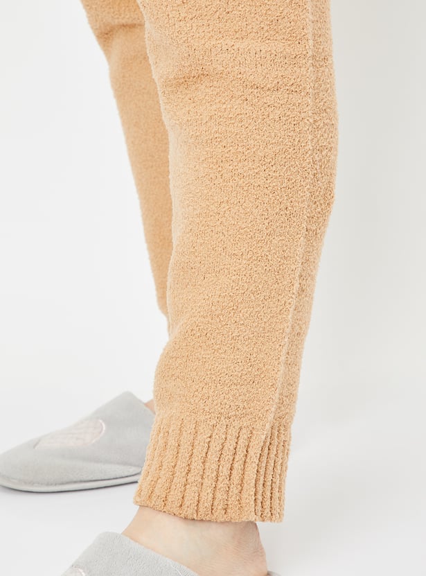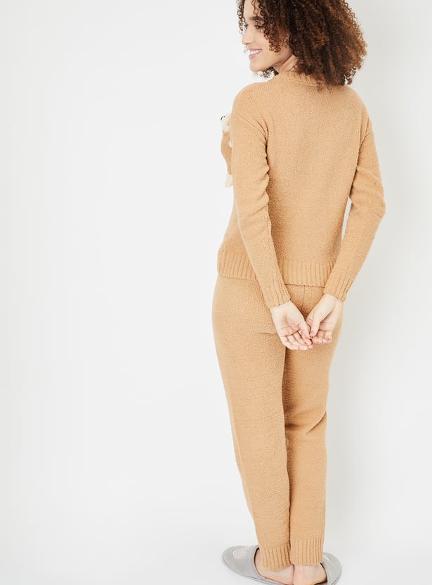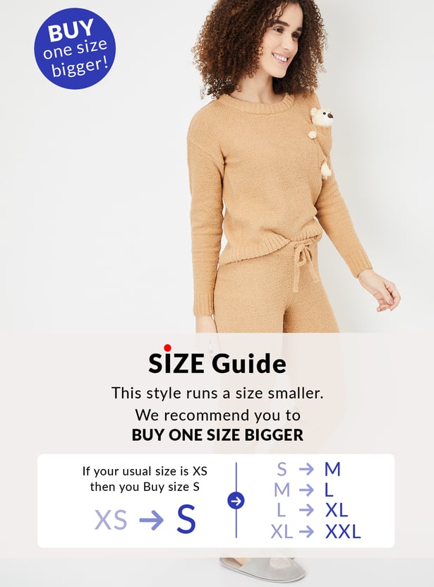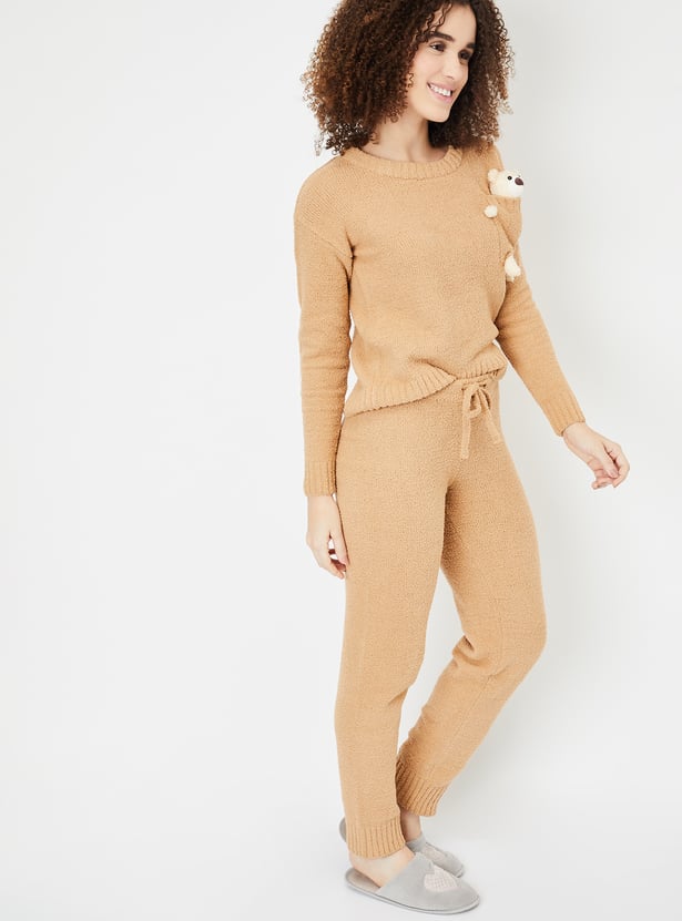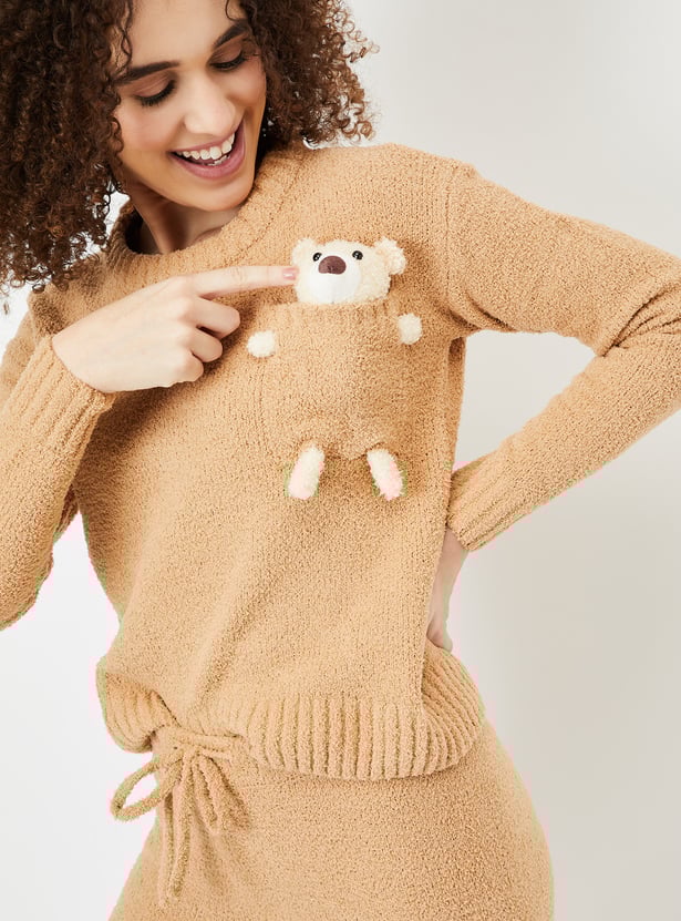 Level up your chill game with this fuzzy sleepwear set. The soft top features an adorable 3D teddy bear pocket applique, while the cozy round neck and full sleeves keep you warm. The elasticated waist pyjamas are full-length, offering the perfect relaxed fit for ultimate comfort.