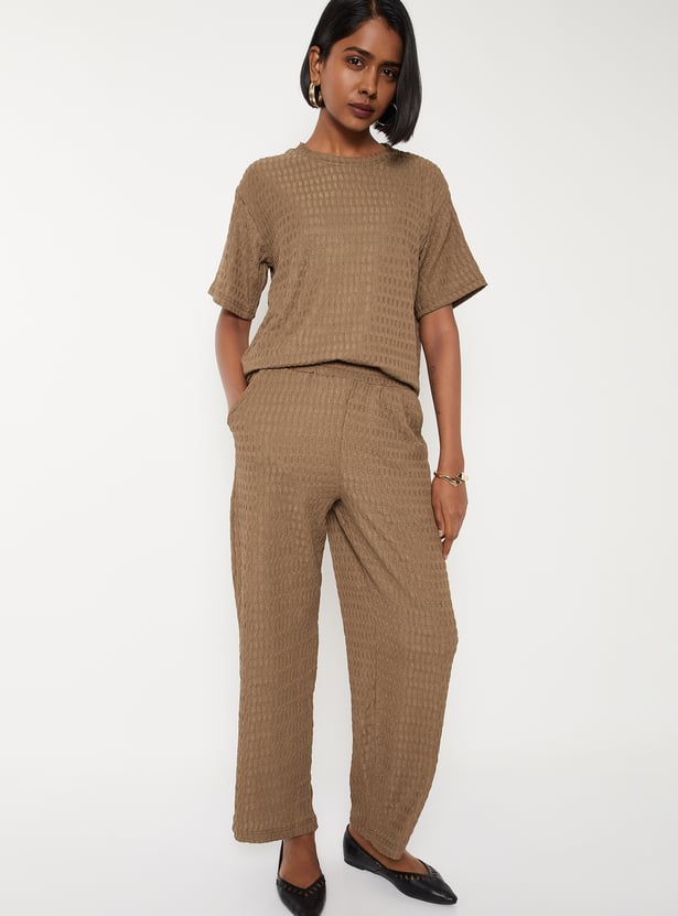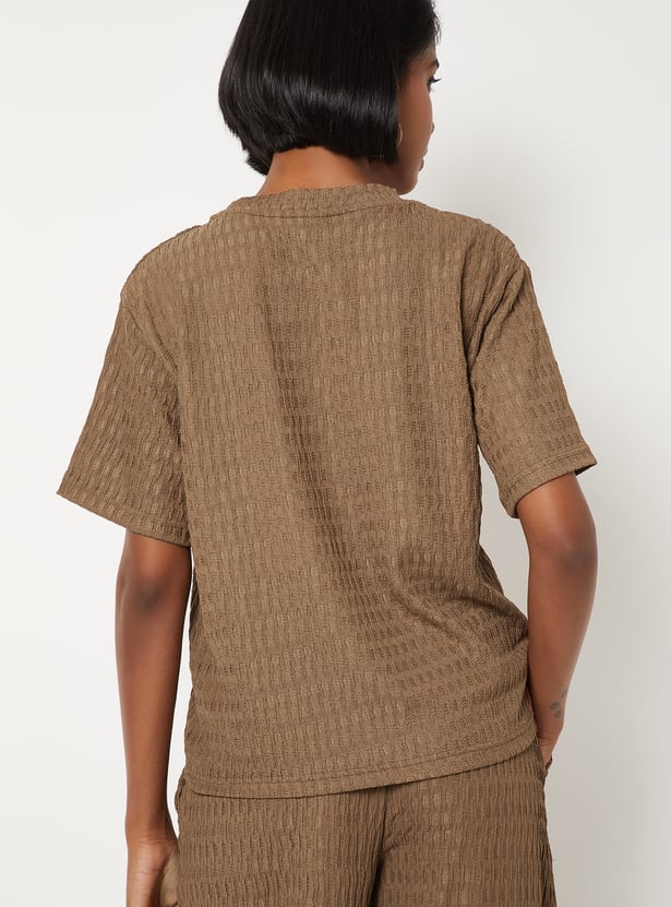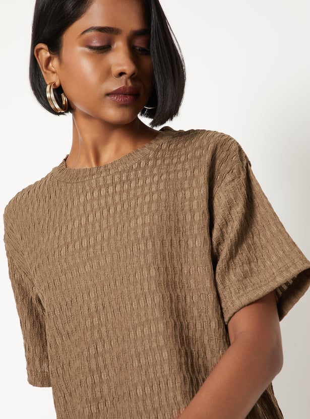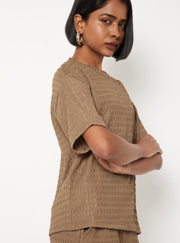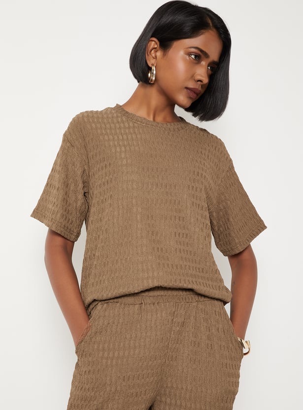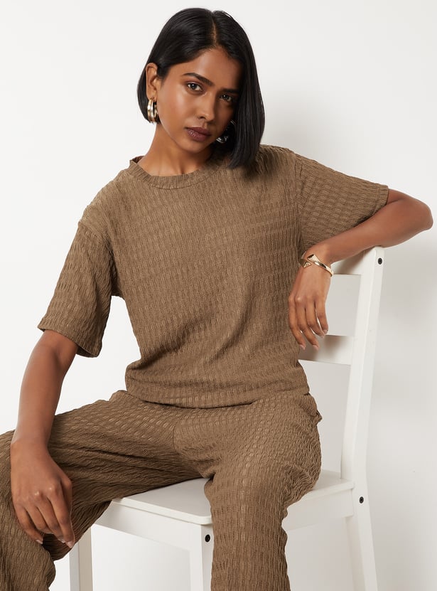 Keep it effortlessly stylish with this woven textured drop-shoulder top. Designed with a round neck and half sleeves, it offers a relaxed fit for all-day comfort. The drop-shoulder detail adds a modern, laid-back touch.