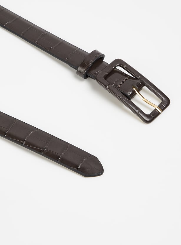 Complete your look with this sleek slim belt, designed with a classic tang closure for a secure and polished finish. A versatile accessory that works with both casual and dressy outfits.