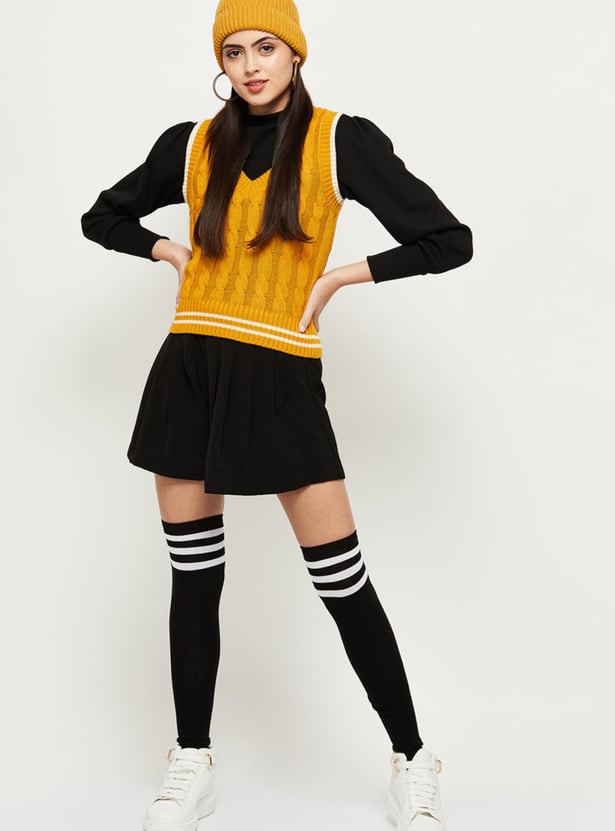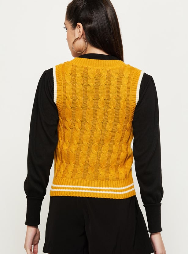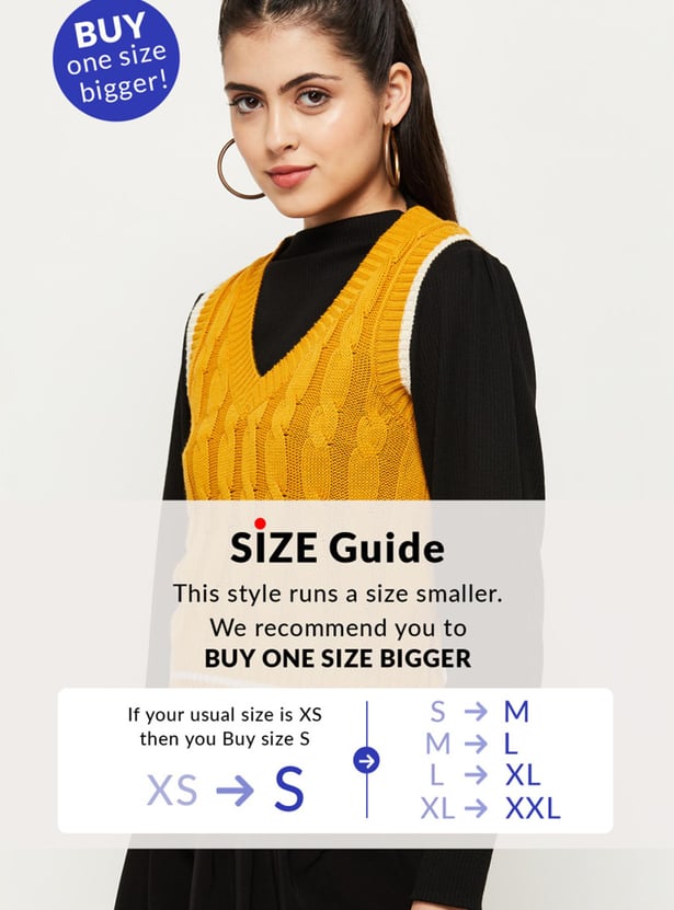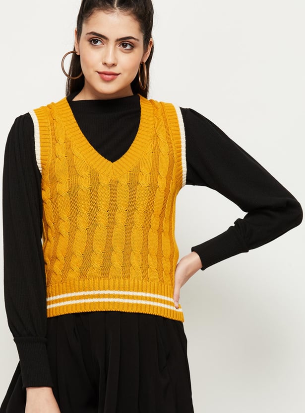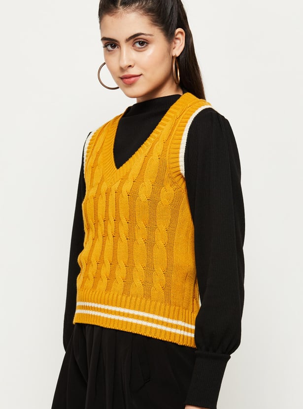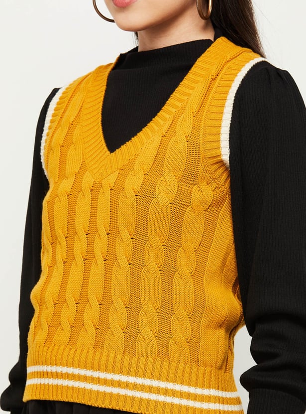 This textured cropped sweater is designed with a V neckline, ribbed hemline, and sleeveless silhouette to keep you warm this winter season.