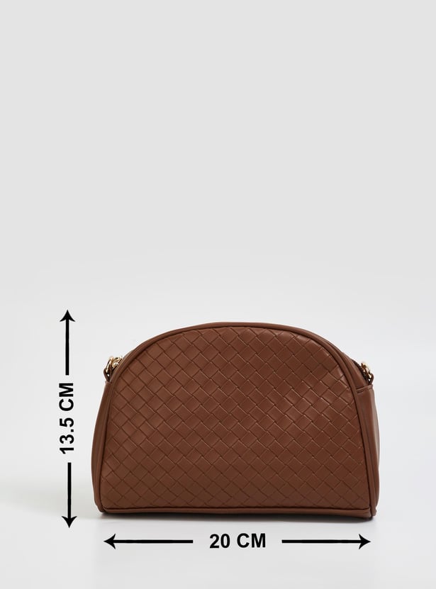 Upgrade your style with this sling bag. It has a woven design on the exterior, a sling strap with chain detail, and a compact compartment with a zip top.