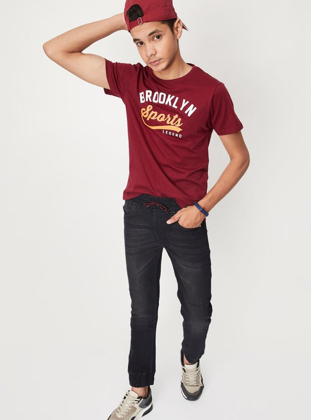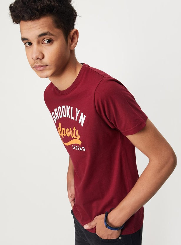 Build his basic wardrobe with this T-shirt. It is designed with a crew neck, short sleeves, and a graphic print on the front. Team up this tee with a pair of jeans and sneakers to ace the look.