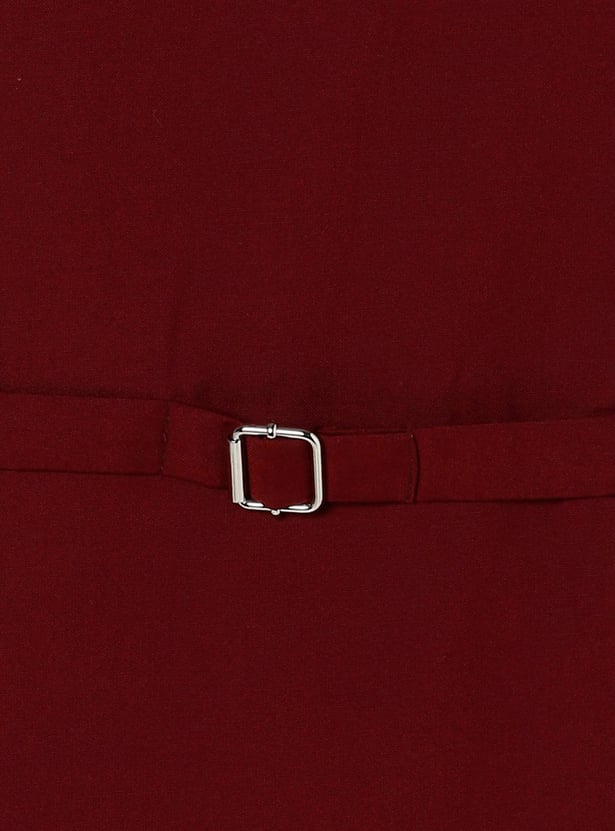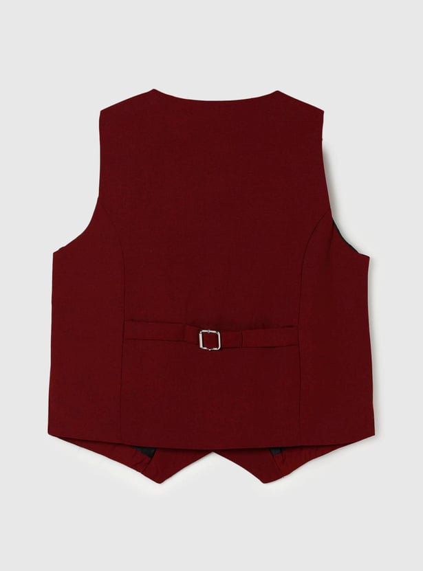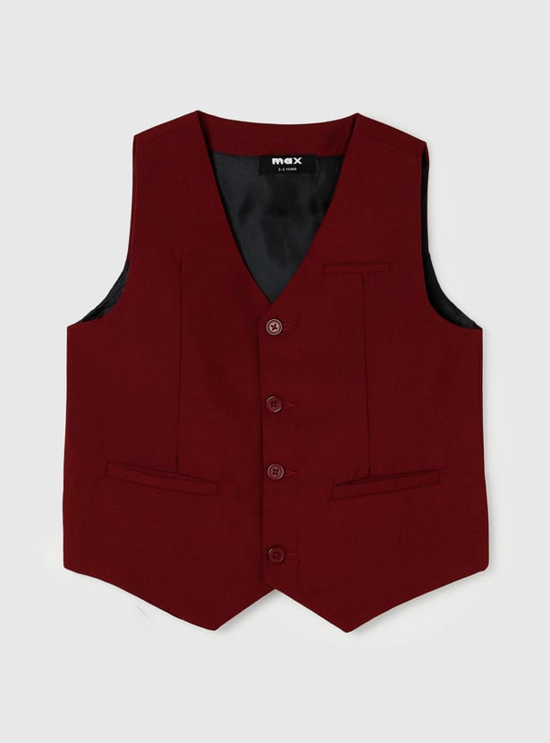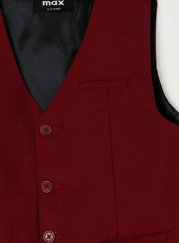 An ideal pick for your little one, this waistcoat is designed with a solid surface, V-neck, button closure, pockets, and a sleeveless silhouette. Pair it up with a crisp shirt and trousers to ensemble the complete look.