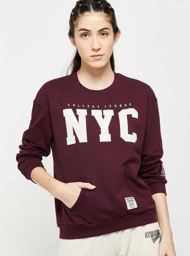 Gear up for the season in this sweatshirt featuring a round neck, drop shoulders, long sleeves, a kangaroo pocket, applique detailing on the front, and ribbed trim. Complete the sporty look with a pair of joggers and your basic sneakers.
