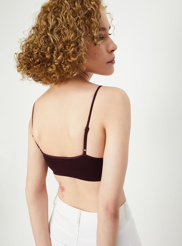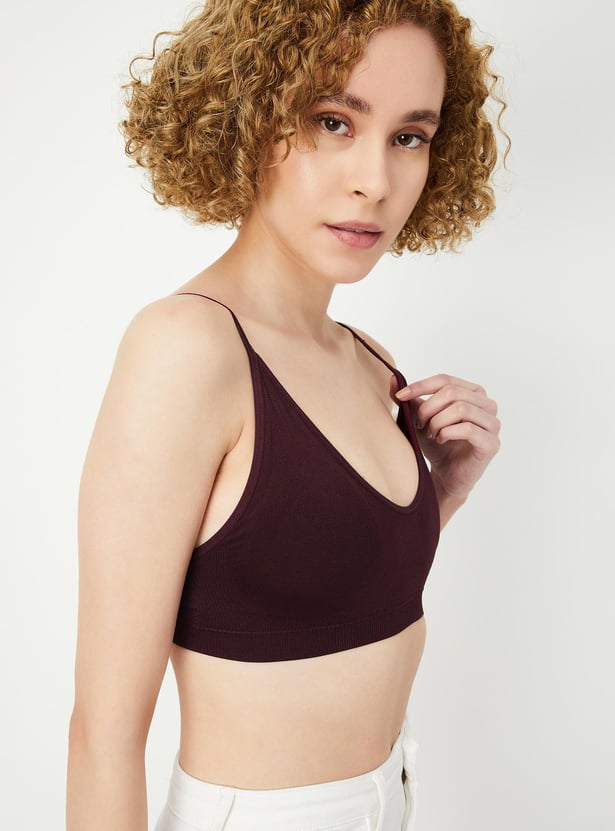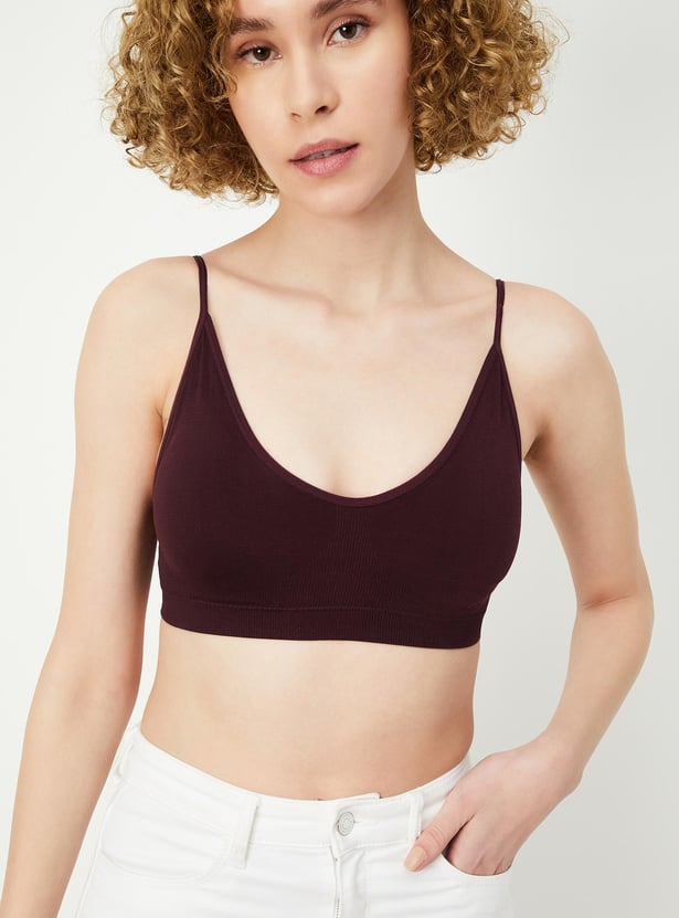 Power through the day in the comfort of this slip bra. It is rendered in a solid tone with spaghetti straps, and a padded, non-wired design. The seam-free design enhances the style.