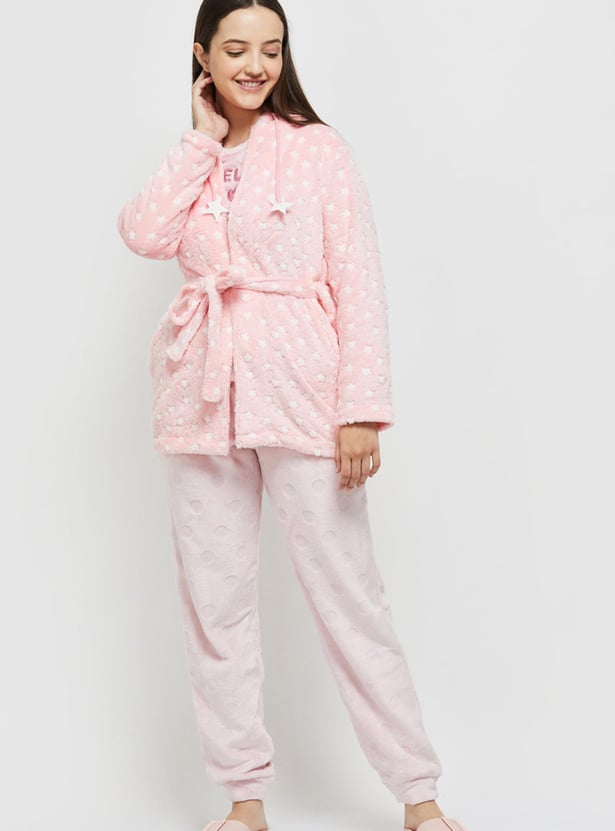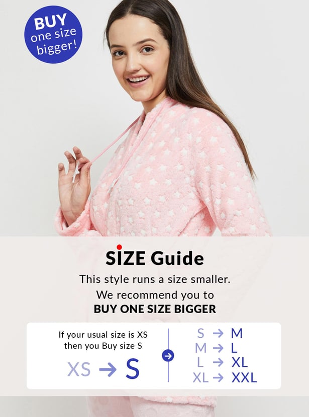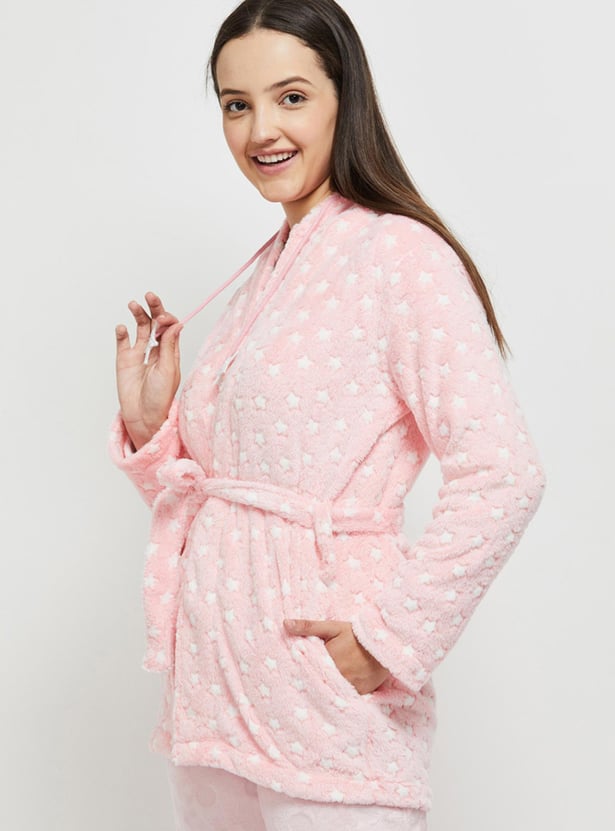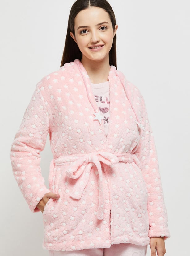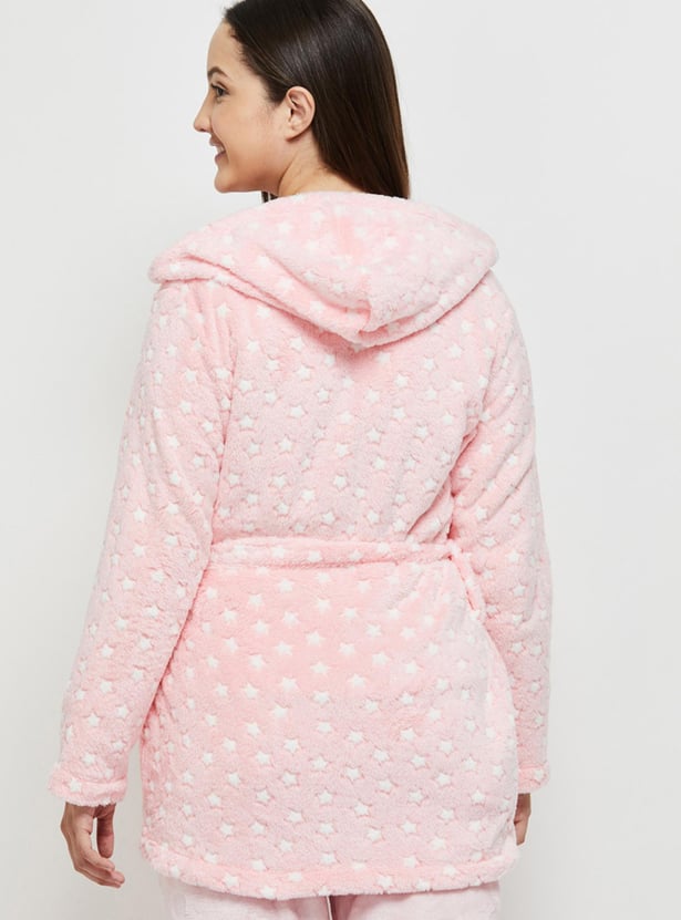 Women Embossed Hooded Fleece Robe with Tie-Up Waist
