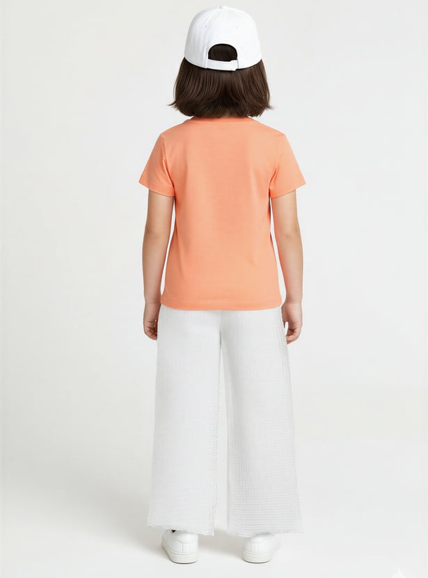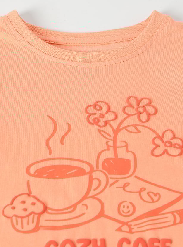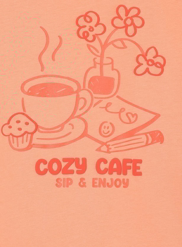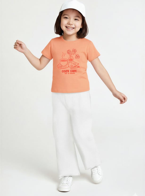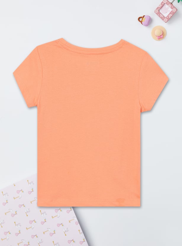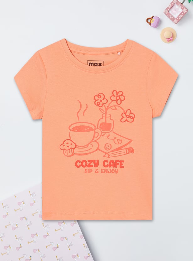 Cute girls’ round neck T-shirt with half sleeves and a vibrant print, offering a comfortable and breathable fit for everyday wear. Perfect for playdates, casual outings, or school.
