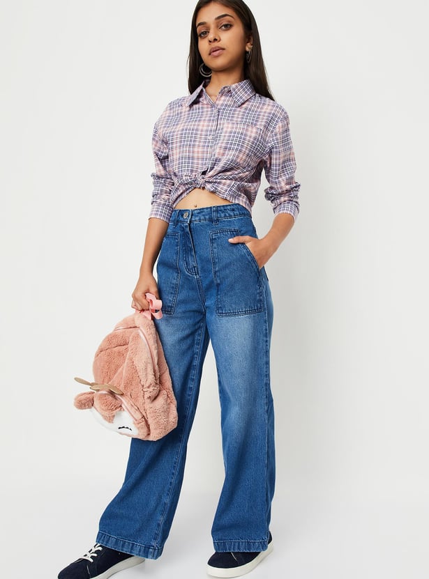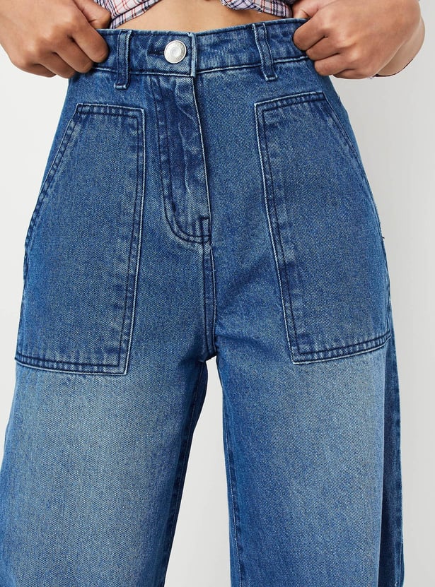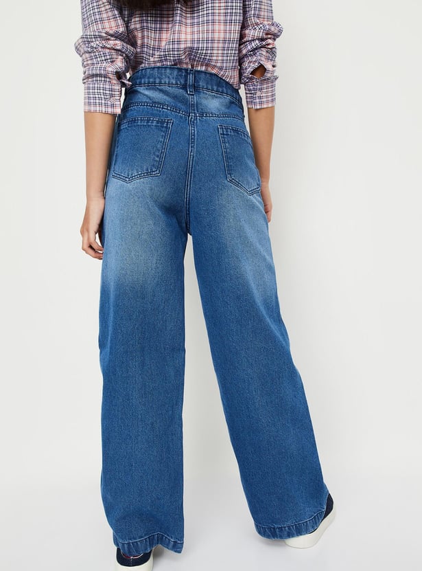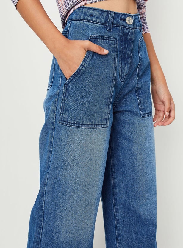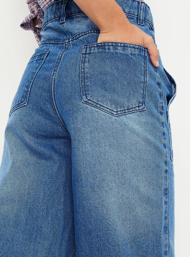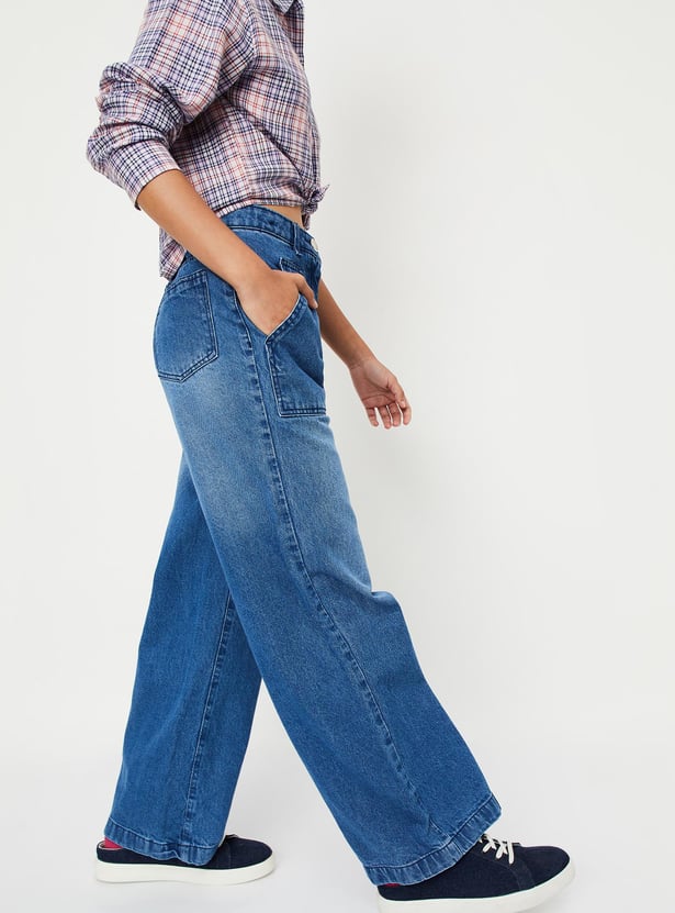 This pair of jeans has wide legs and is an all-time favourite. It has a full-length profile, washed surface, four patch pockets, and a belt loop waist. To nail the look, wear this pair with a T-shirt and trainers.
