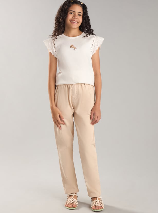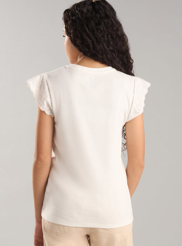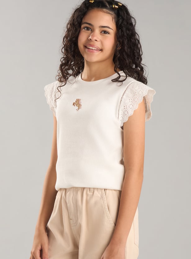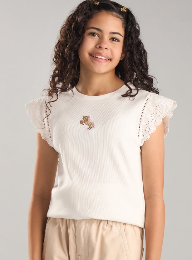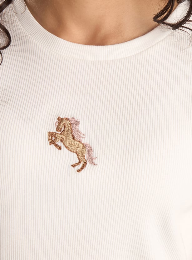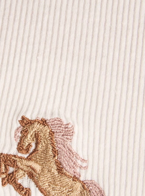 This ribbed top is a perfect blend of elegance and style. Featuring Schiffli half sleeves and a round neck, it’s beautifully detailed with horse embroidery on the front for a unique touch. Ideal for casual or semi-formal outings!