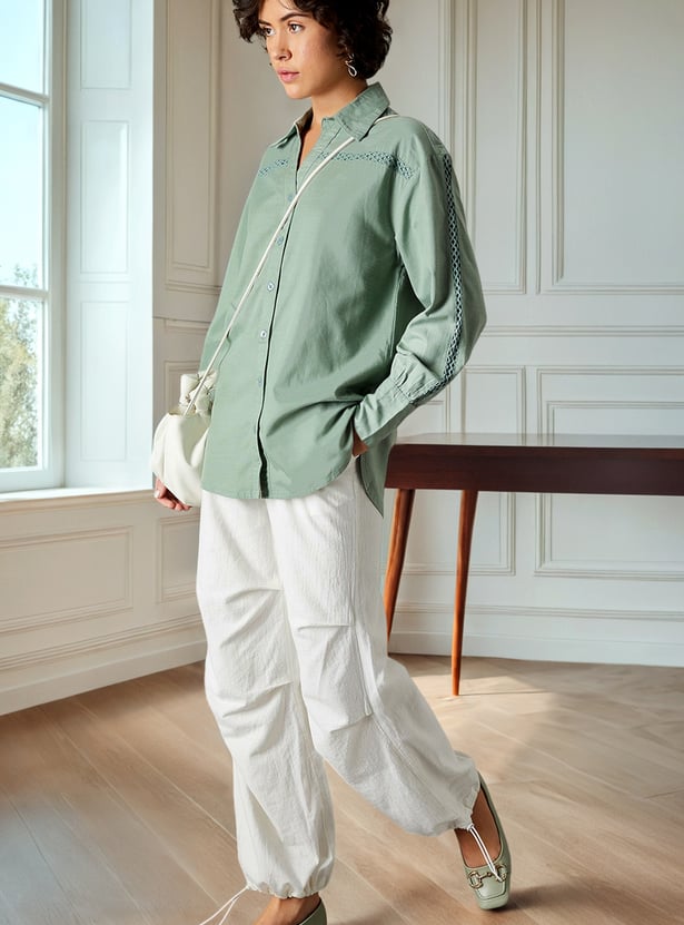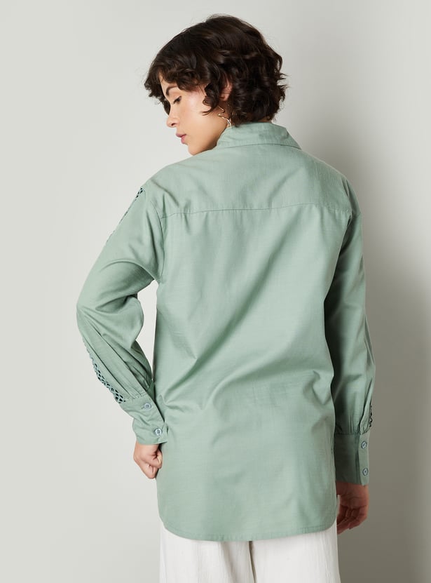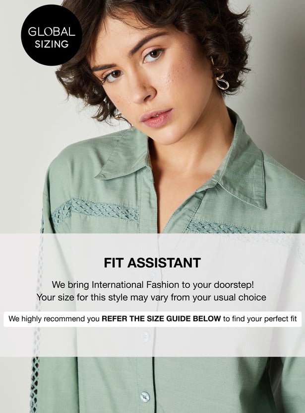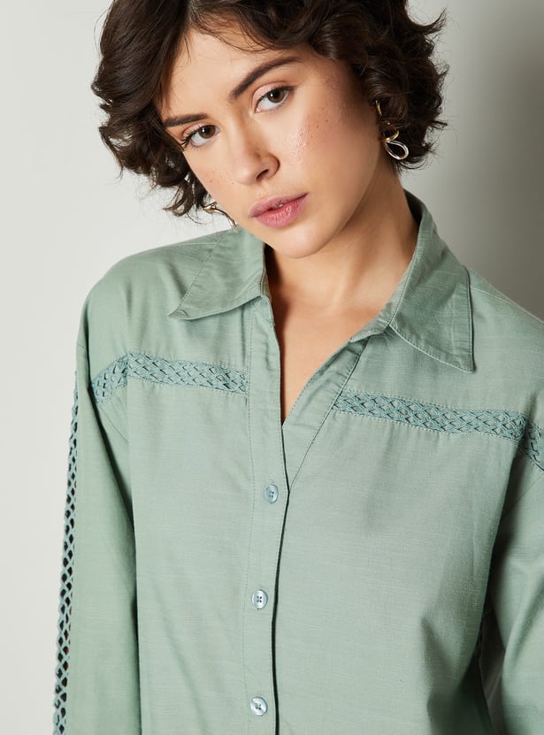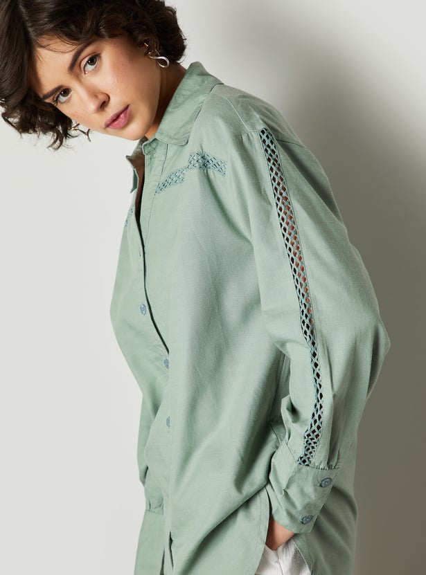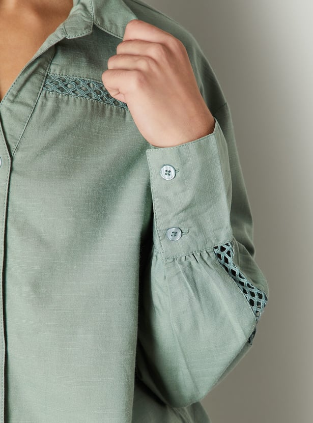 Elevate your wardrobe with this chic oversized shirt, featuring delicate lace insert details for a touch of femininity. The spread collar and full sleeves offer a classic silhouette, while the lace accents add a contemporary and stylish twist.