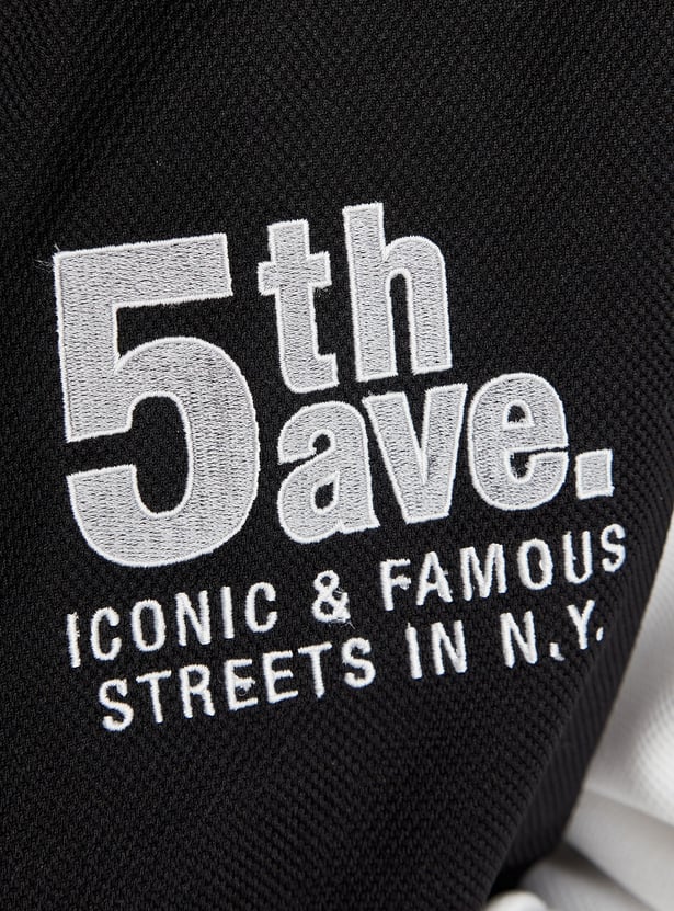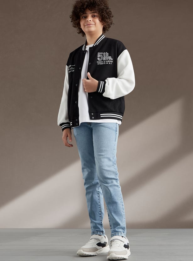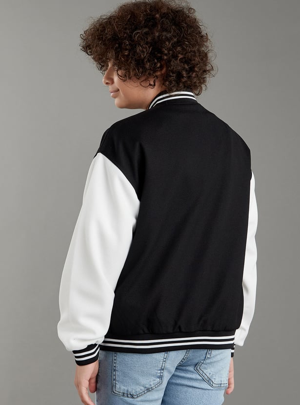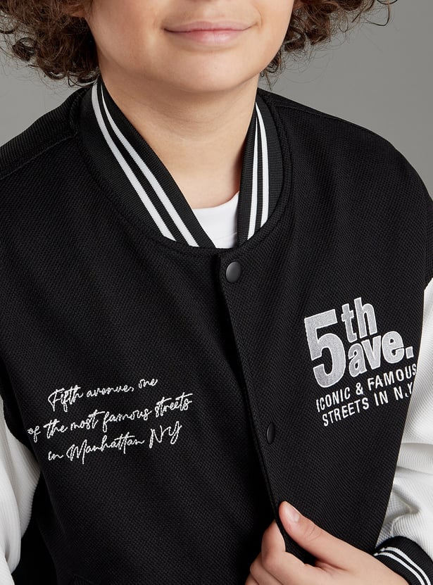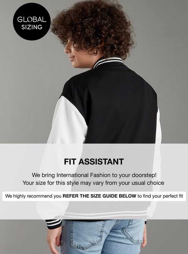 Keep your young adventurer warm and on-trend with this stylish varsity jacket. Featuring a classic baseball collar, full sleeves, and a button-through placket, it’s designed with a bold colour-blocked pattern and functional pockets. The typographic embroidery adds a cool touch, making this jacket a must-have addition to your kid's collection for standout style and comfort.