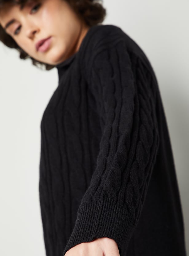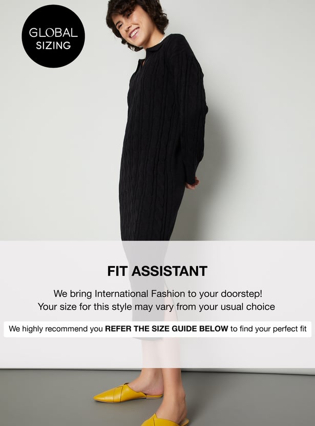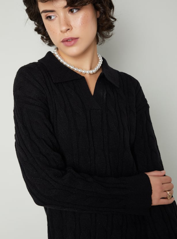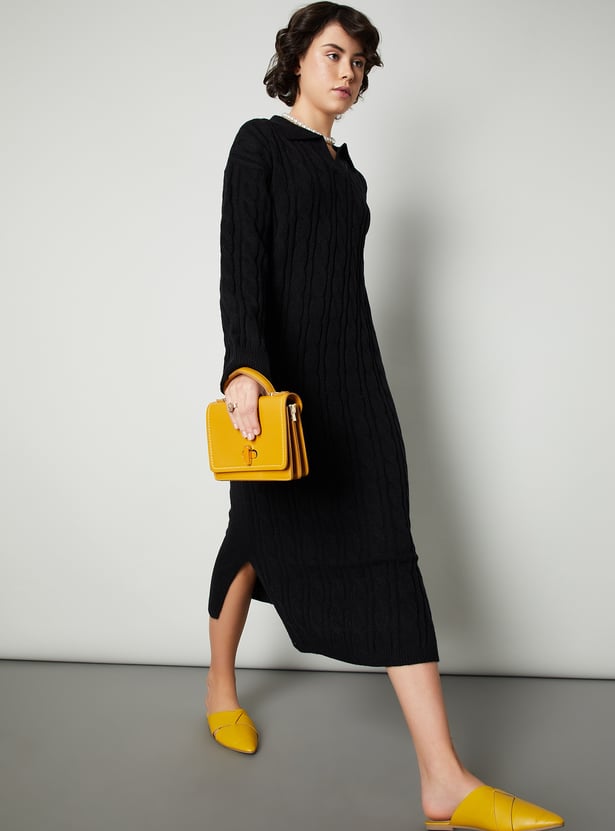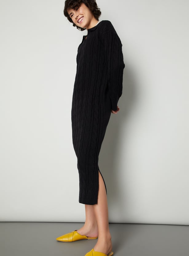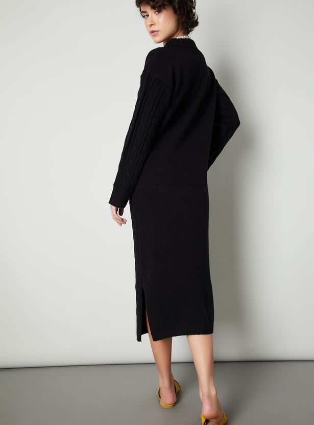 Look effortlessly put together in this sweater dress. The classic cable knit pattern adds texture and depth, while the polo collar brings a sporty, yet refined touch. The midi-length profile flaunts a drop-shoulder sleeve, side slits, and ribbed trim.