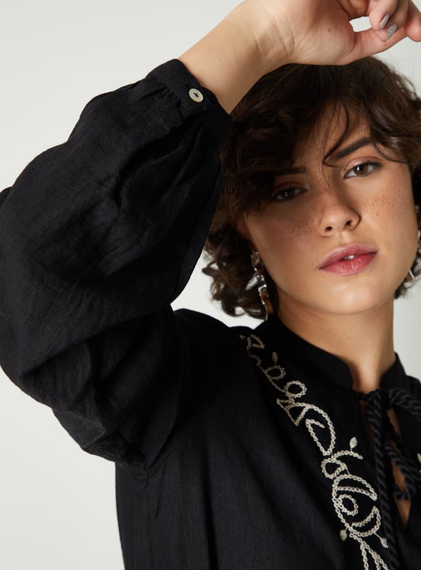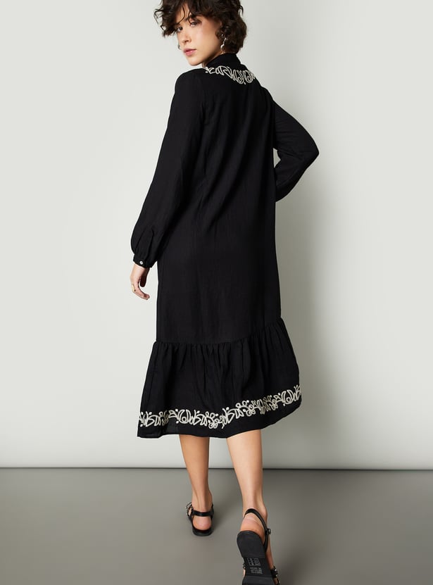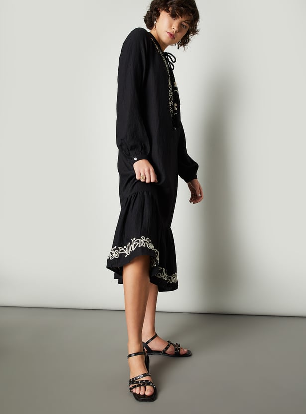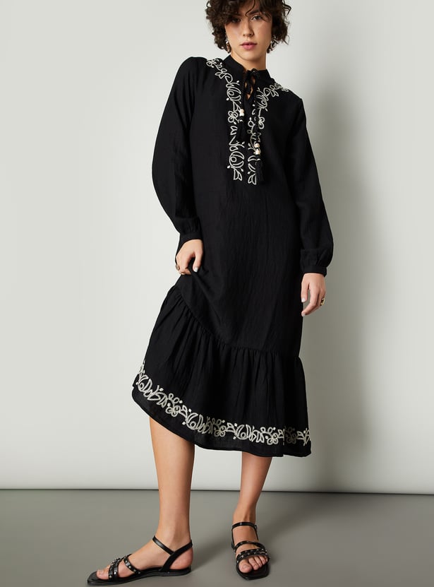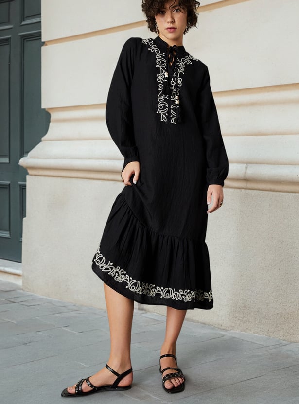 Feminine and full of flair, this midi-length dress is a wardrobe standout. The tie-up neck along embroidered yoke and hem adds a charming look. The single-tiered flared hem gives the dress a graceful flow, while the bishop sleeves add a hint of drama.