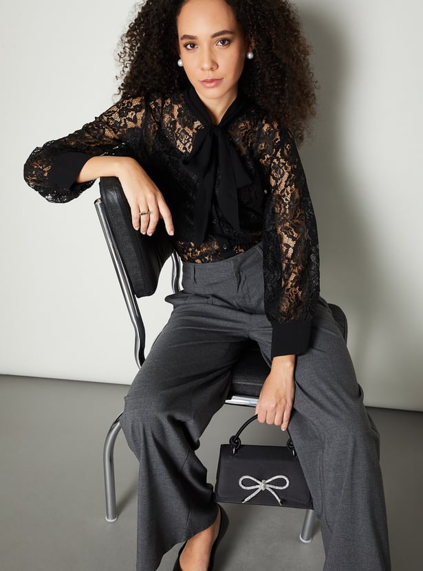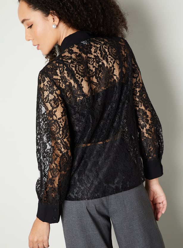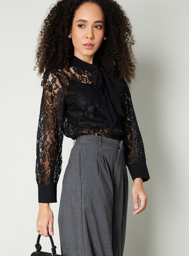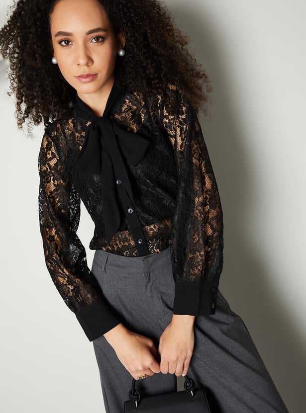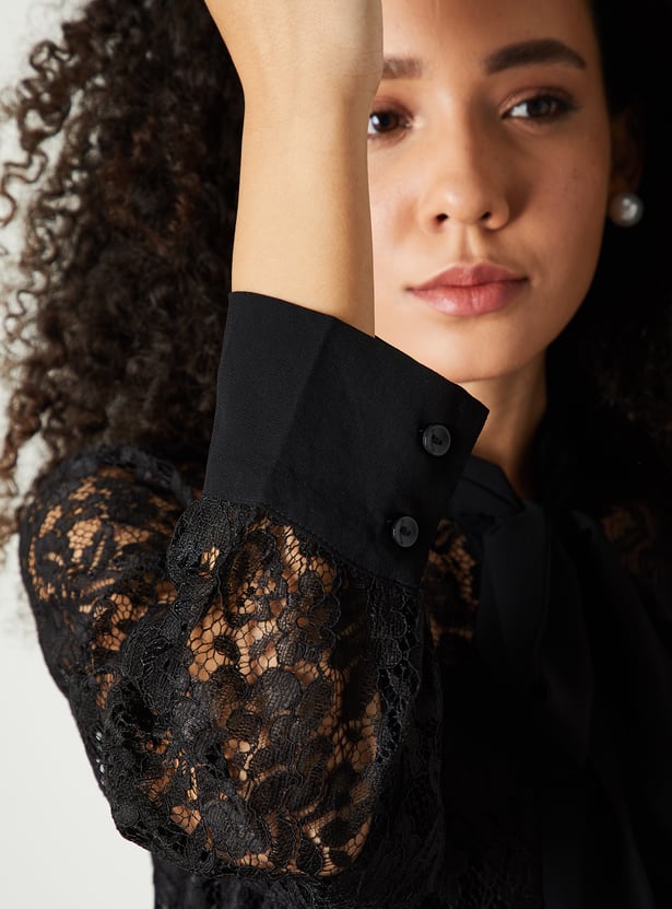 This lace pussybow blouse features delicate lace detailing, full sleeves, and a buttoned front for a sophisticated, feminine look. The pussybow neckline adds an elegant, vintage-inspired touch to the design.