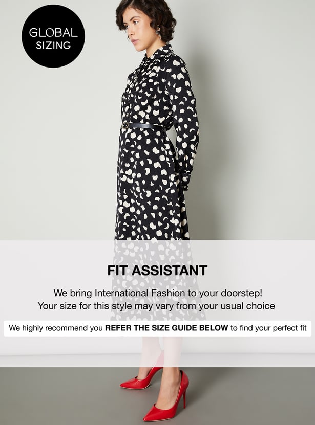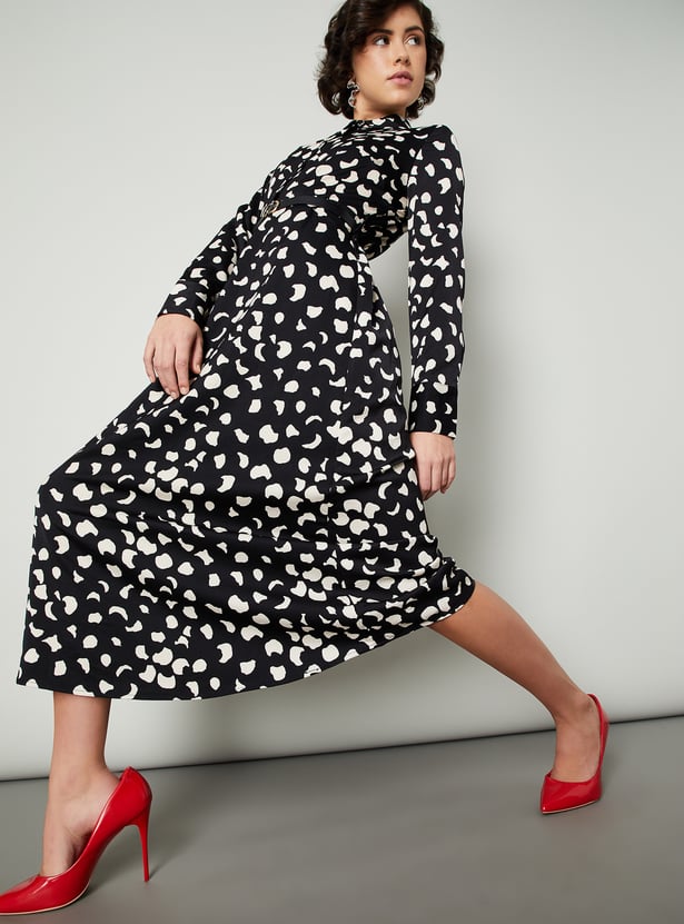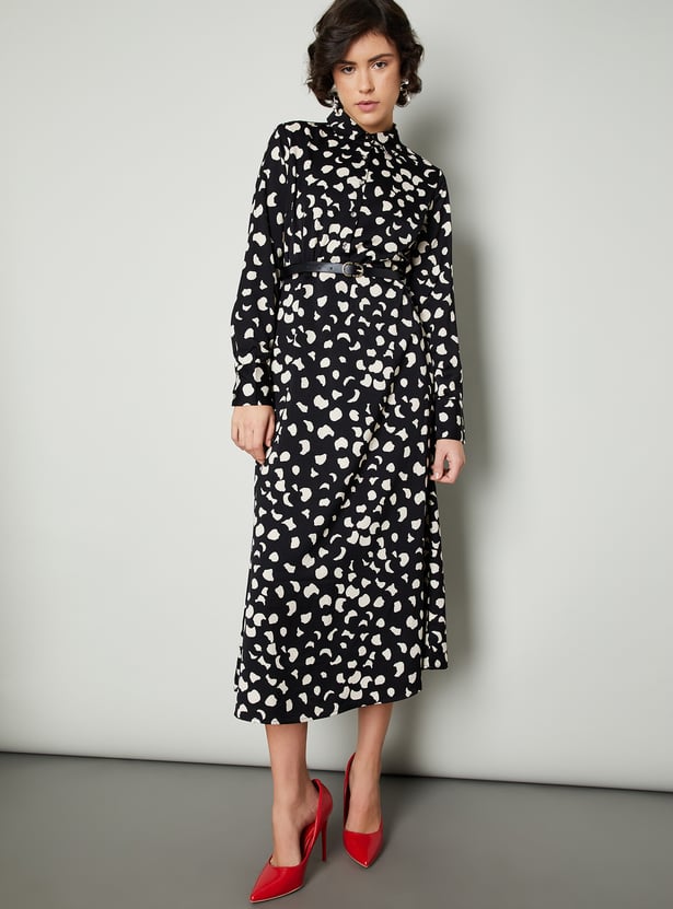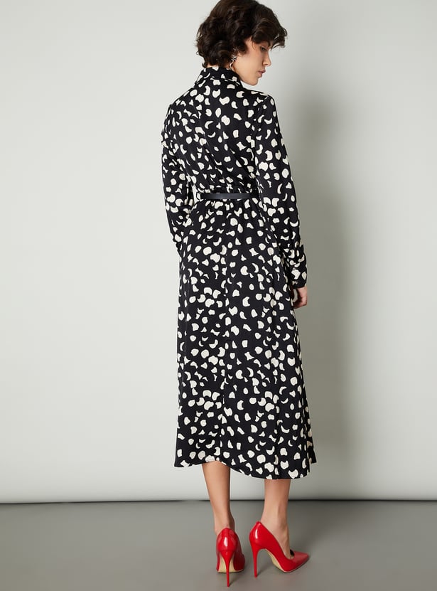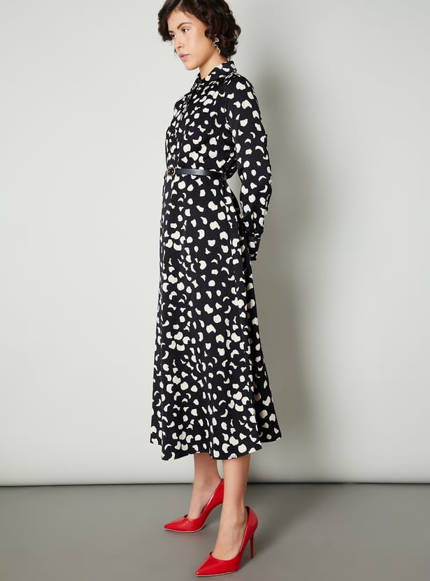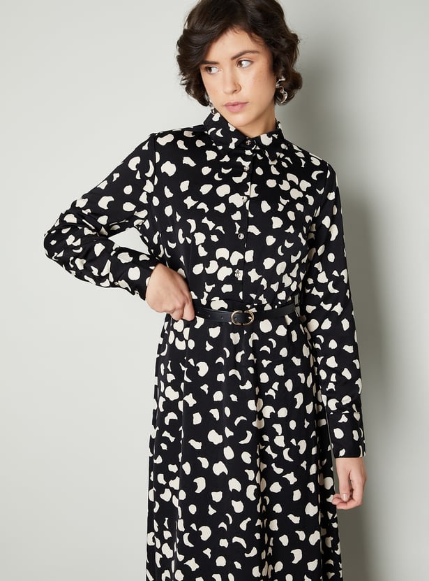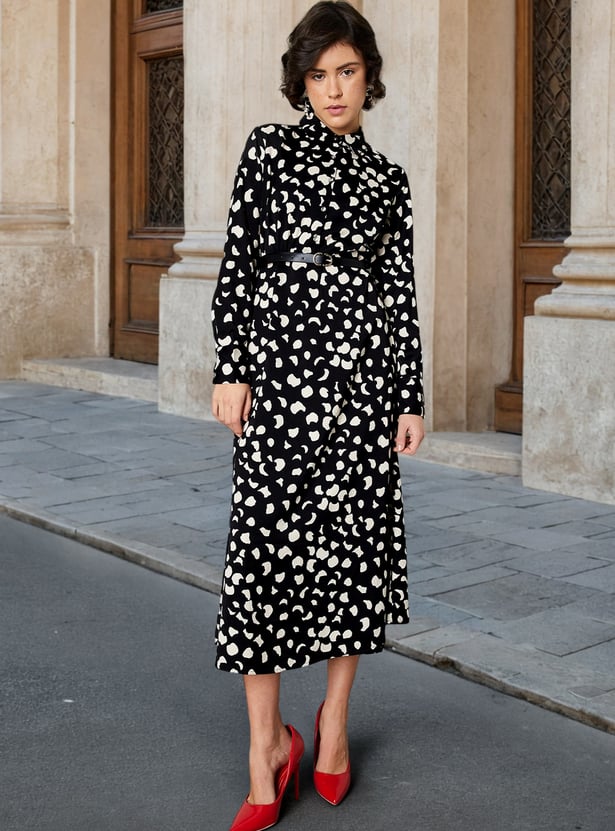 Step into effortless elegance with this dress. The all-over prints add an intriguing look. The classic shirt dress silhouette is defined with a belt. It has a spread collar, full sleeves with buttoned cuffs, and a midi-length profile.