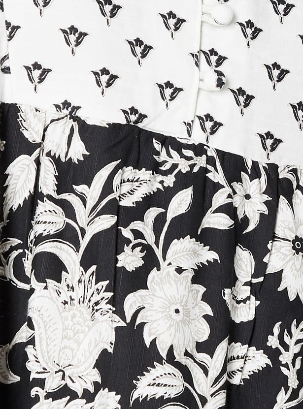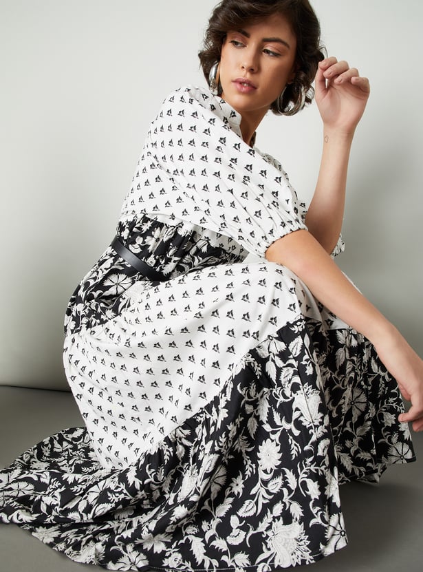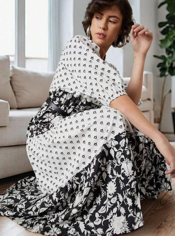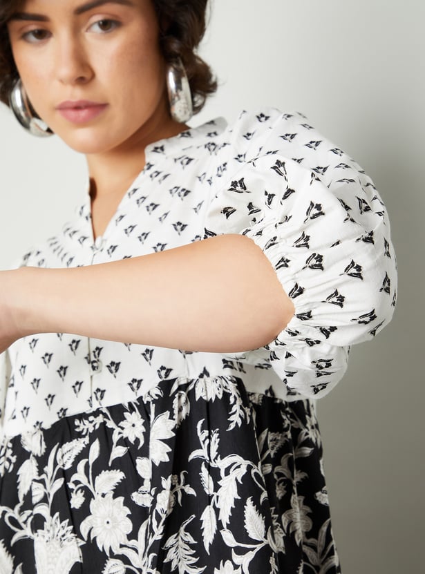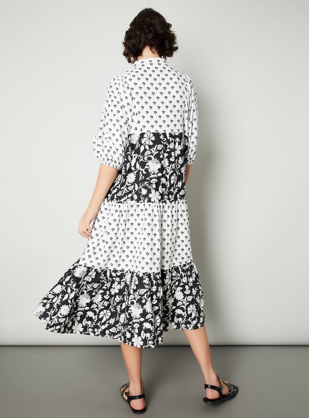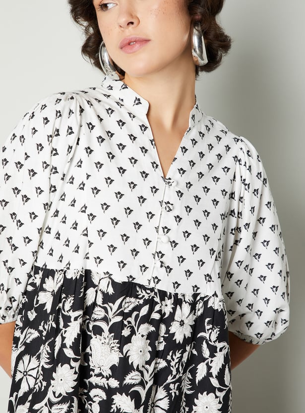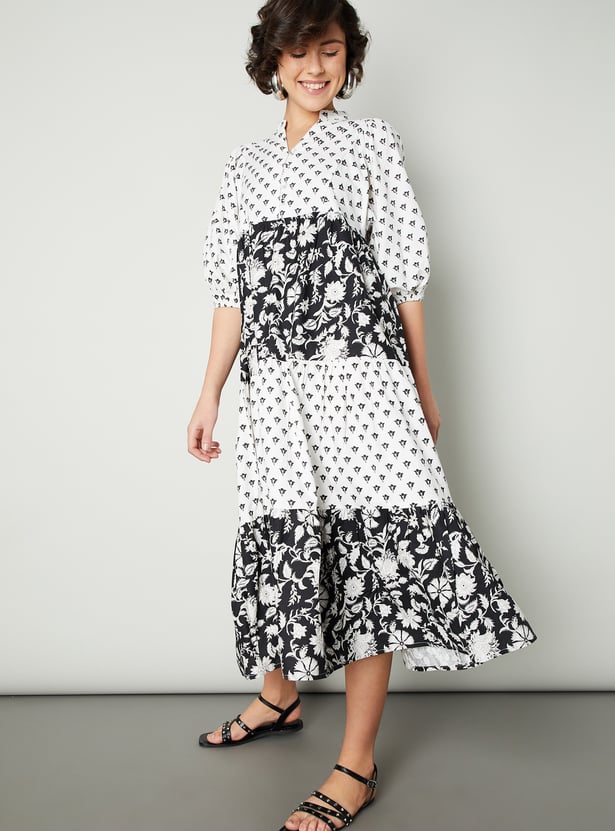 Flowy, fun, and effortlessly chic, this dress is your go-to for stylish, all-day comfort. It has a band collar, a tiered design with mixed prints, and puffed sleeves. The A-line profile offers a breezy look.