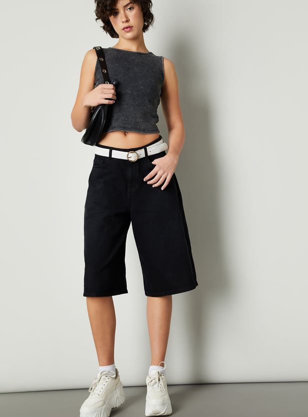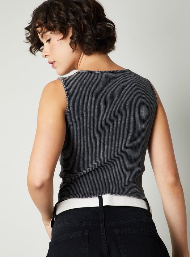 Elevate your casual look with this ribbed crop top. Featuring an acid-washed surface, a round neckline, and a sleeveless design, it combines comfort and style, making it a perfect choice for any occasion.
