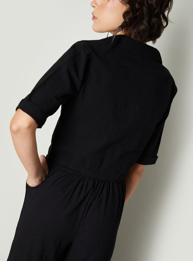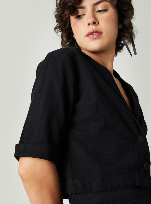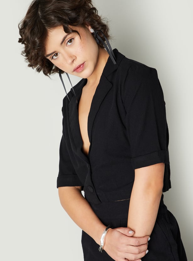 Elevate your wardrobe with this solid cropped top, featuring a chic lapel collar and button placket. The half sleeves add a modern touch, making it perfect for a stylish, laid-back look.
