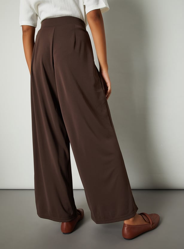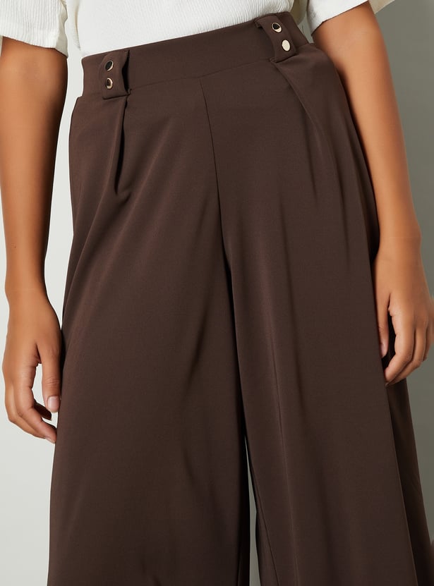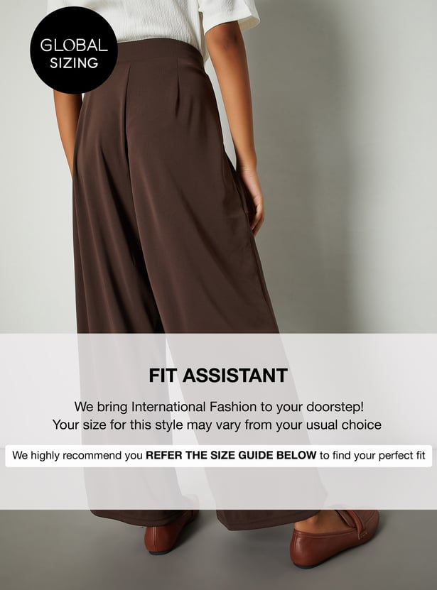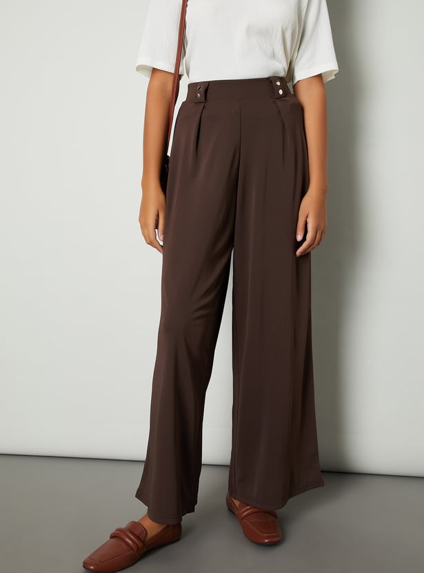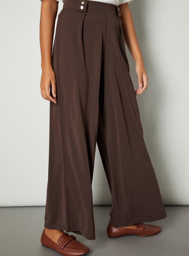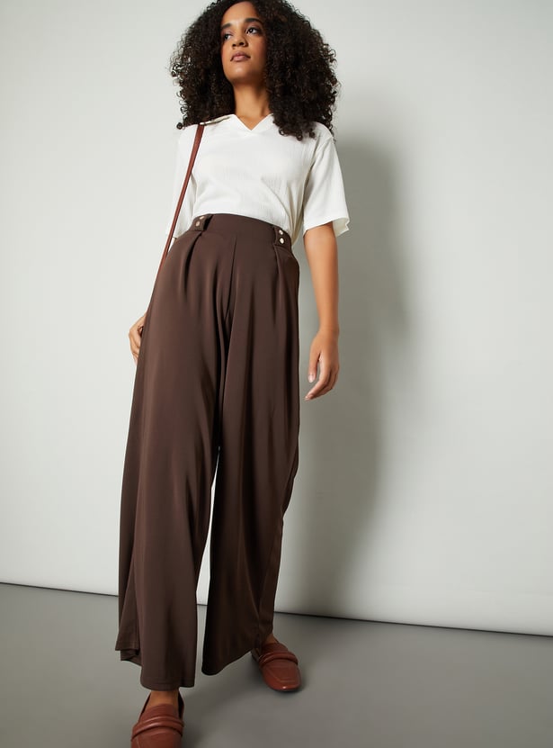 These pleated Flared trousers offer a graceful blend of comfort and style. Featuring an elasticated waist and decorative button accents, they create a flowing silhouette that’s perfect for both workdays and relaxed outings.