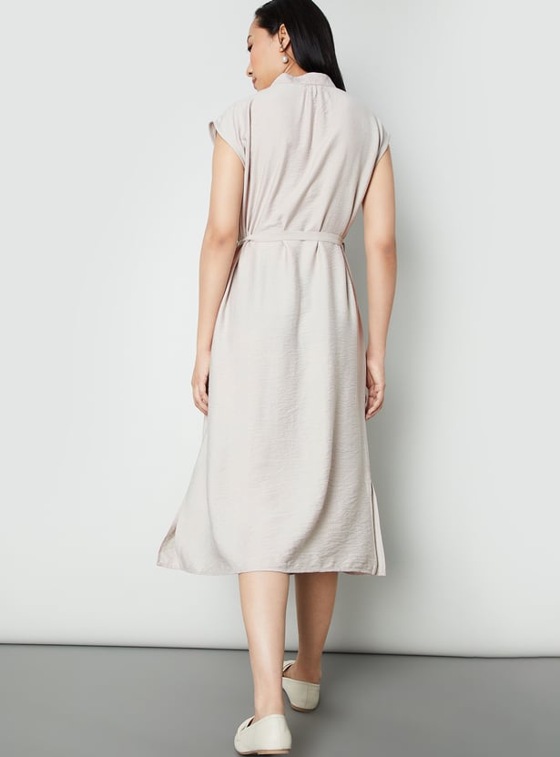 This textured belted midi dress exudes understated elegance with a band collar neck, extended sleeves, and side slits for ease of movement. The button closure and waist belt add structure to its relaxed silhouette, making it perfect for both casual and semi-formal occasions.