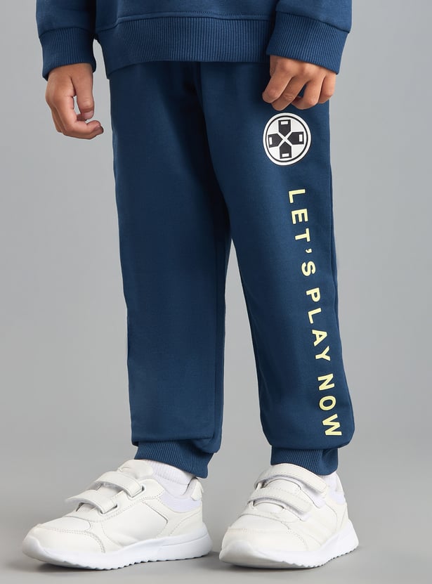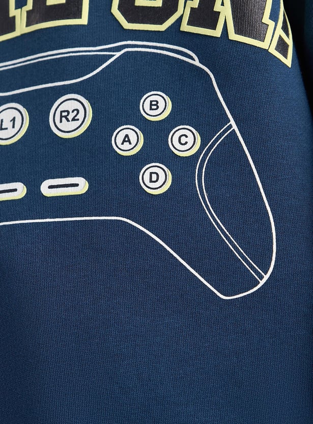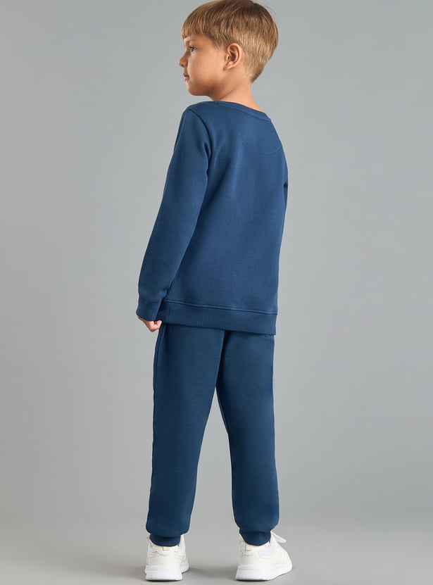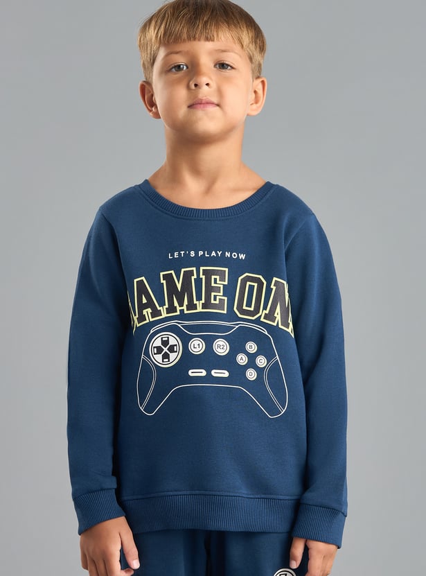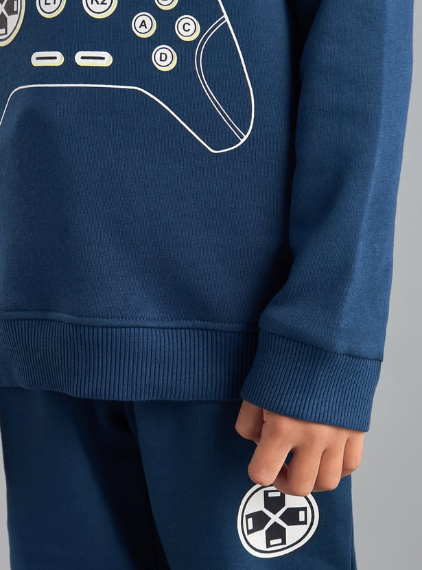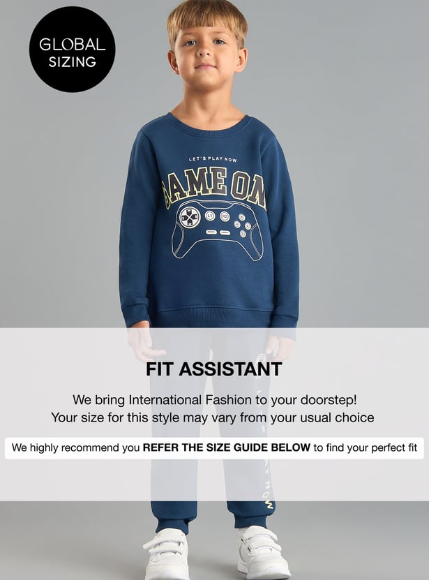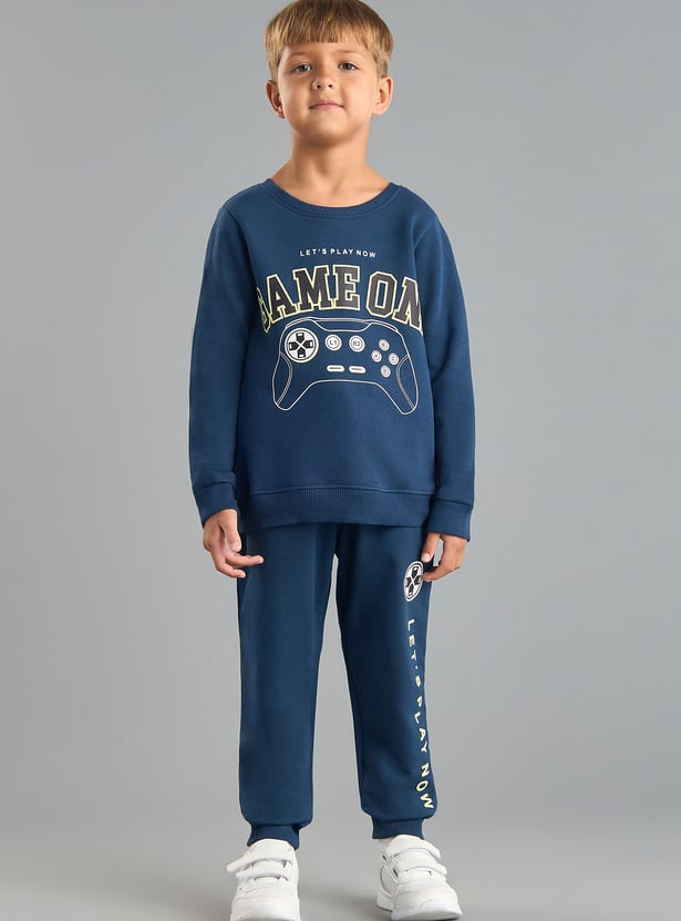 Get ready for ultimate comfort with this printed joggers set. The crew-neck sweatshirt features full sleeves and a fun print, while the matching joggers come with an elasticated waist for a relaxed fit. Perfect for a cozy, playful look on casual days!