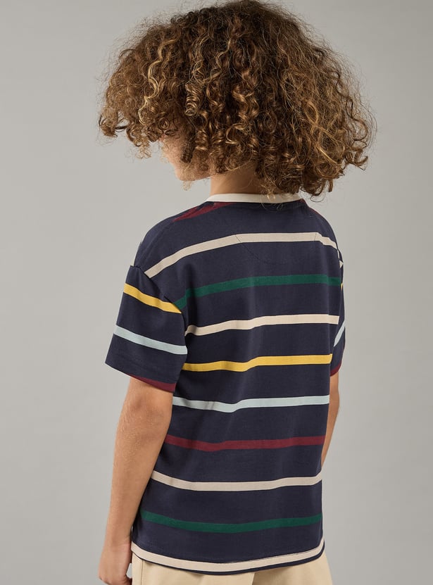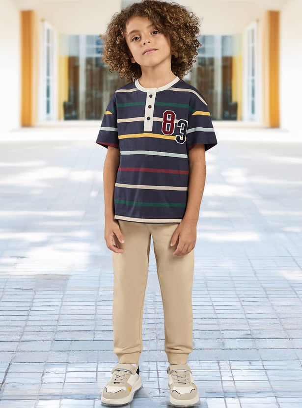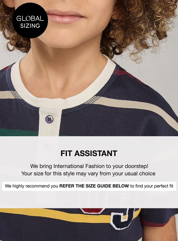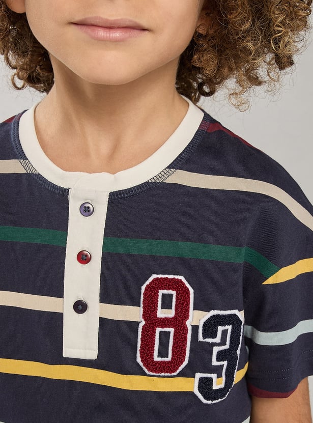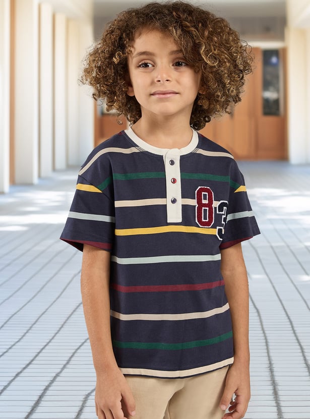 Add a playful touch to your kid's casual wardrobe with this striped T-shirt. Featuring a sporty applique on the chest, short sleeves, and a Henley neck, it combines style and comfort for active youngsters.