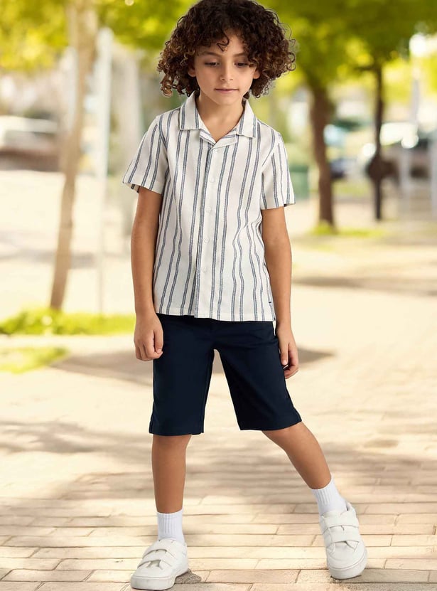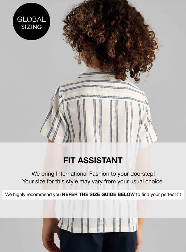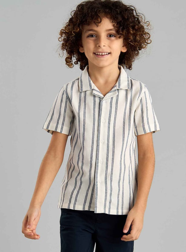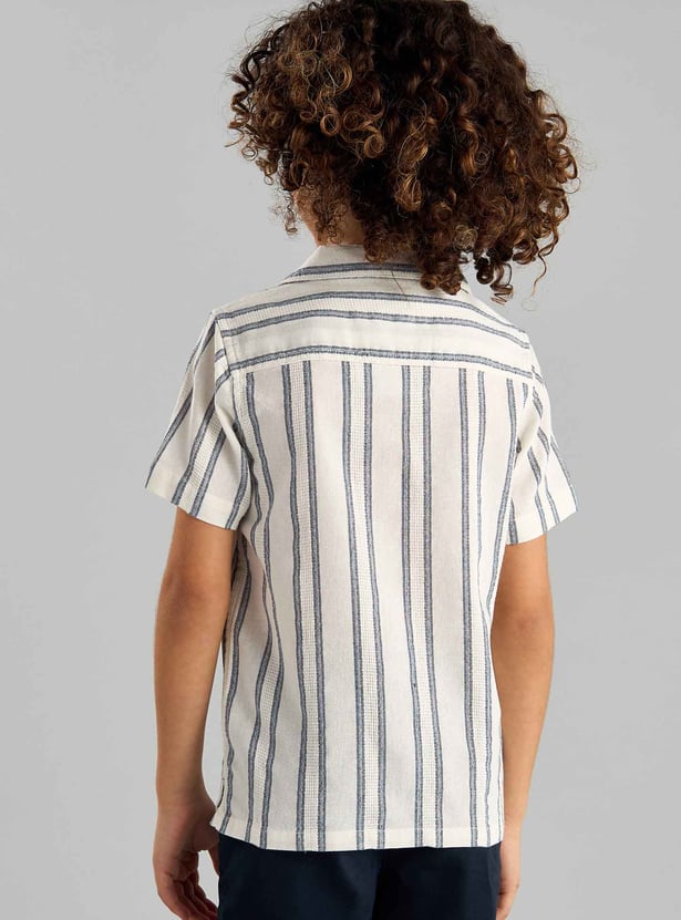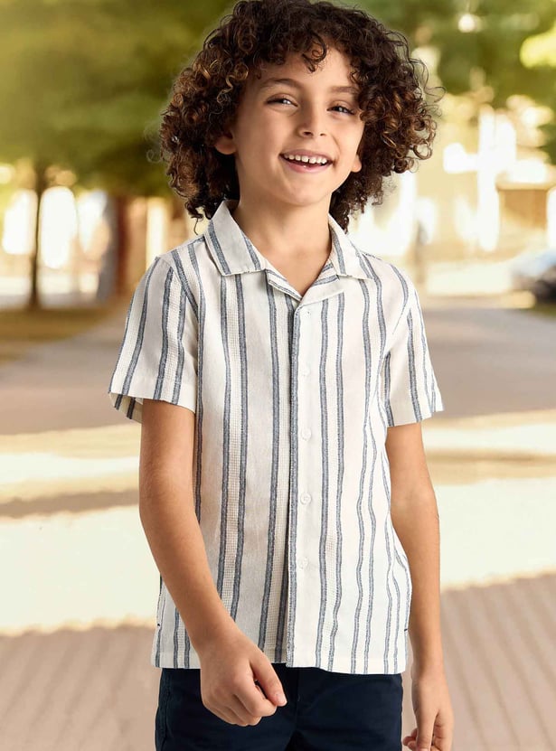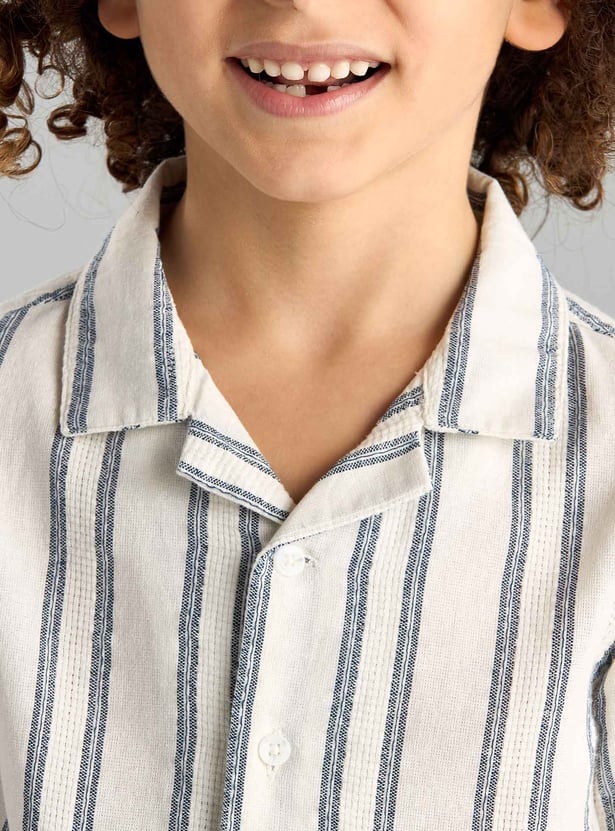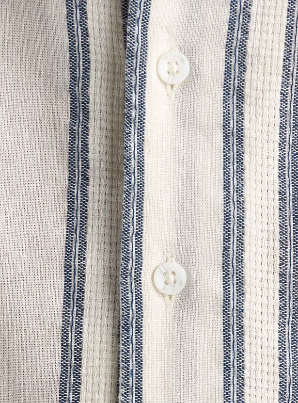 Keep it classic with this striped shirt, featuring a resort collar, button placket, and half sleeves for a timeless silhouette. A patch pocket adds a functional detail to its clean design, making it ideal for both casual and semi-formal looks.