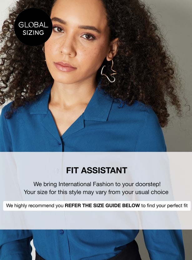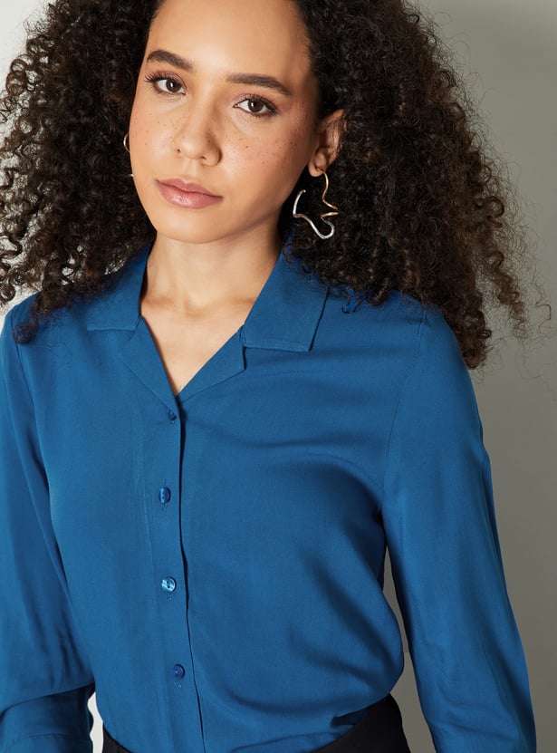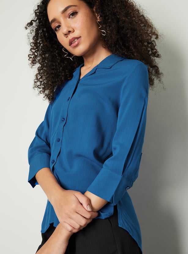 Elevate your wardrobe with this solid blouse, featuring a resort collar and button placket for a sophisticated yet relaxed look. The 3/4th sleeves with button cuffs add a stylish, refined touch to this versatile piece.