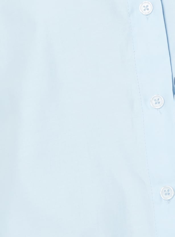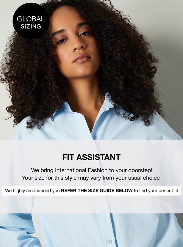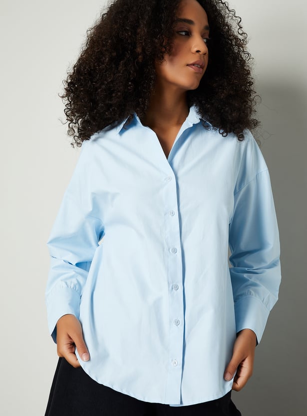 This solid oversized shirt combines relaxed comfort with classic style. Featuring a spread collar, button placket, and full sleeves with button cuffs, it offers a versatile silhouette perfect for layering or wearing solo.