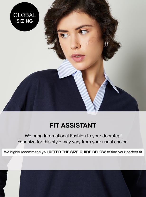 This twofer top gives you a layered look without the hassle. It features a striped shirt with a collared neck, full sleeves, and a layered hem.
