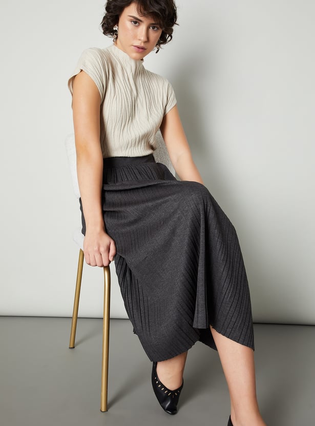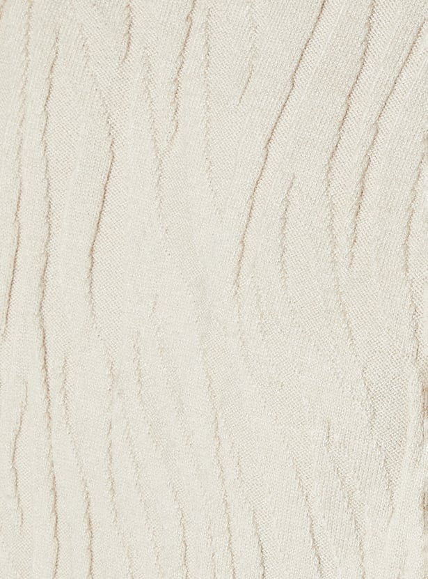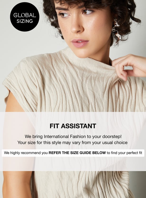 Upgrade your cosy collection with this top. The knit construction with embossing adds a textural element. It has a mock collar, half sleeves, and ribbed trim.