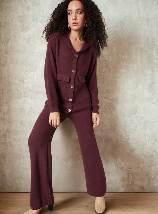 This knit cardigan offers both comfort and style, featuring a hooded neck, full sleeves, and buttoned flap pockets for a functional yet fashionable touch.