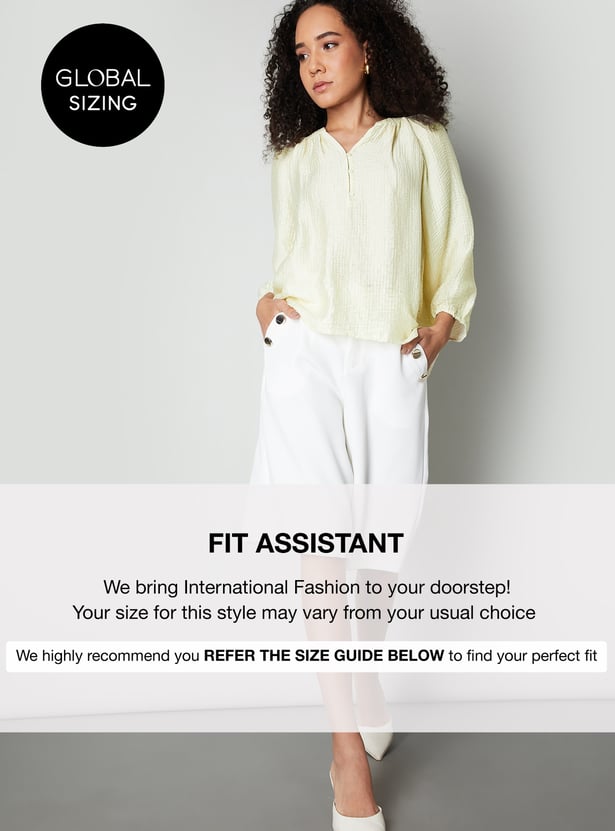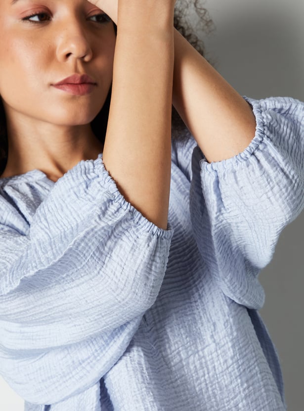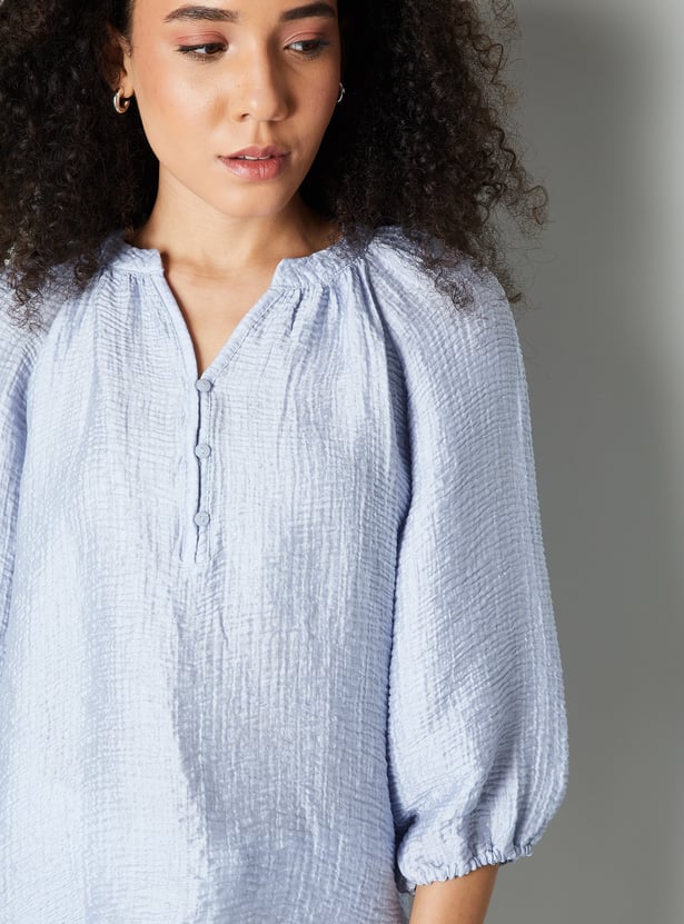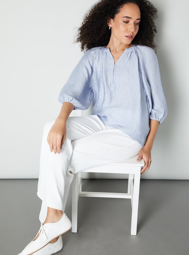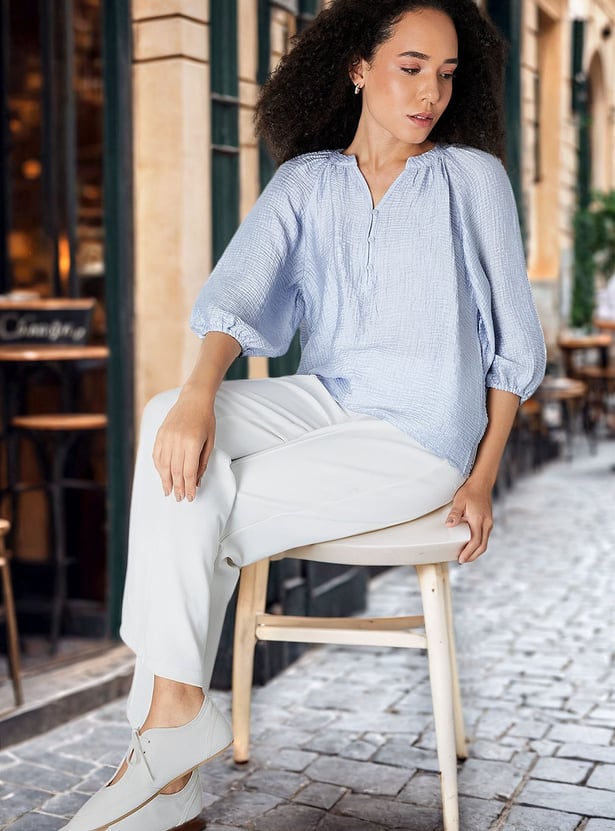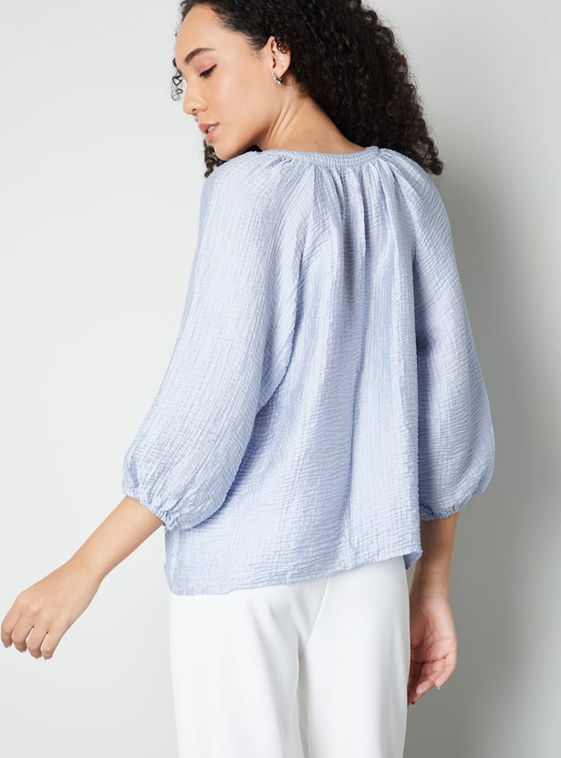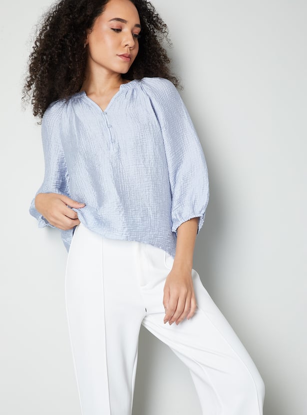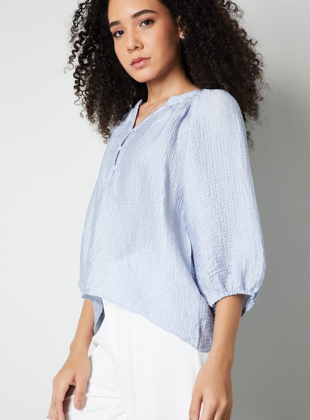 Add a touch of elegance to your wardrobe with this textured blouse, designed with a v-neck, and 3/4th sleeves. The intricate texture adds a refined, stylish element, making it perfect for both work and casual outings.