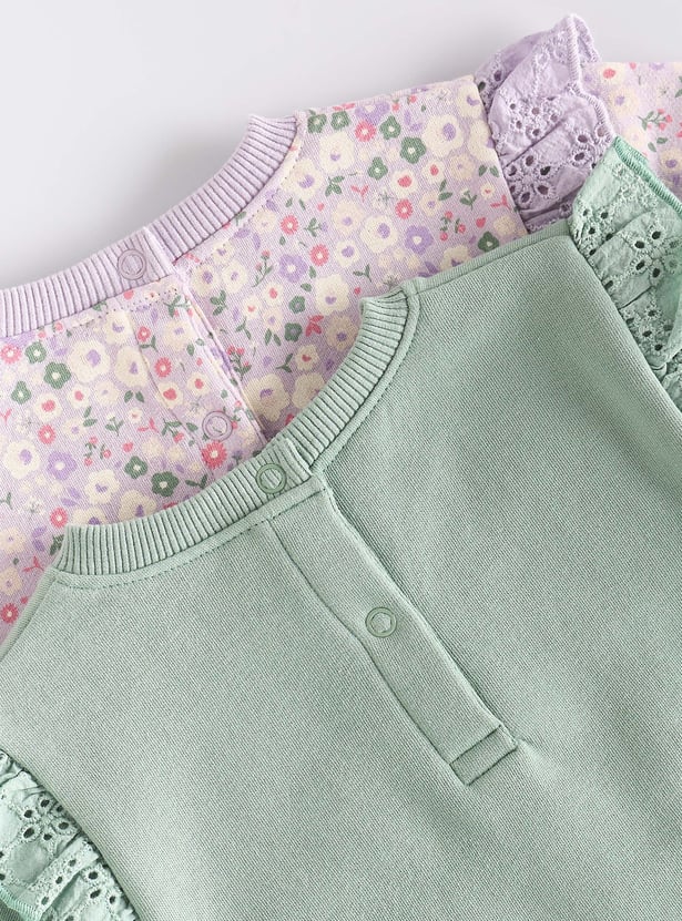 Perfect for active little ones, this two-pack of sweatshirts features a vibrant print and playful ruffle design that will capture your child's imagination. Crafted for all-day comfort and breathability, these sweatshirts have full sleeves and a round neckline for added warmth. Plus, the button closure makes dressing a breeze.