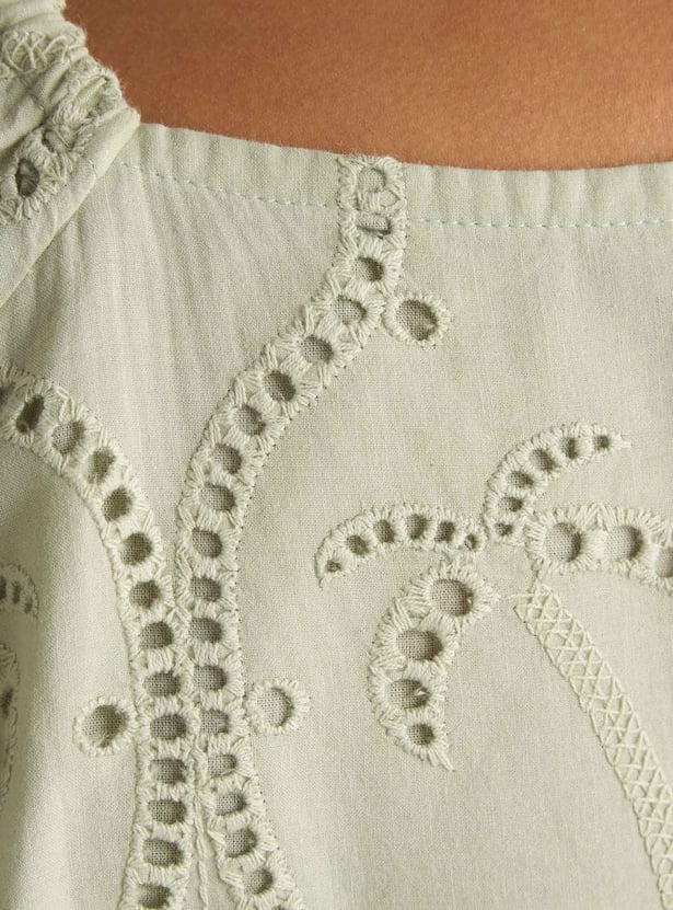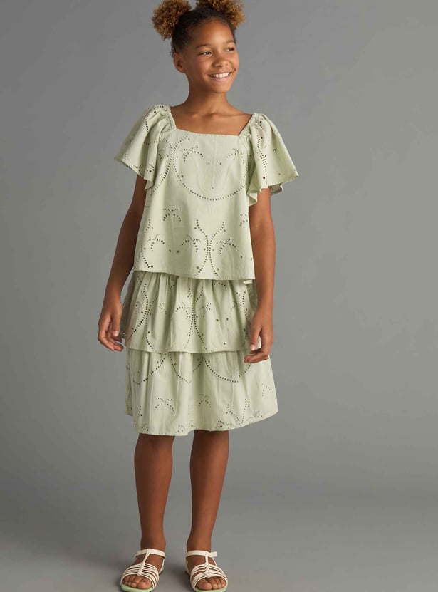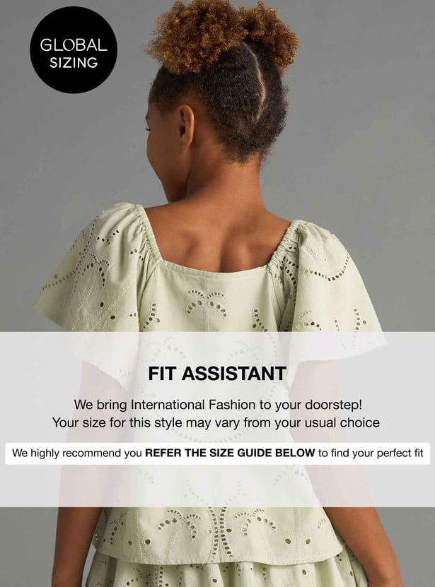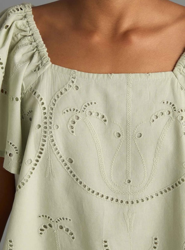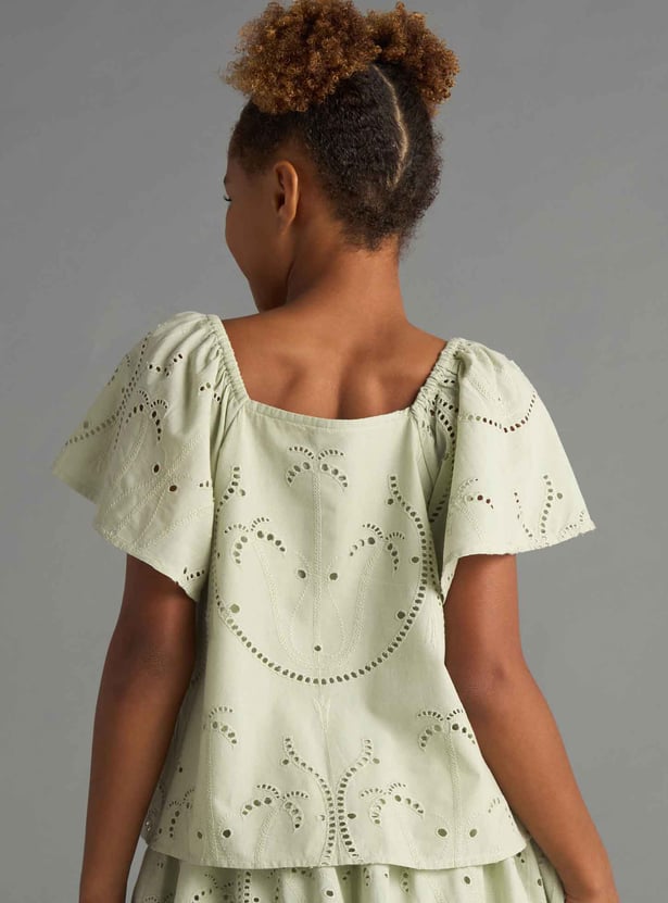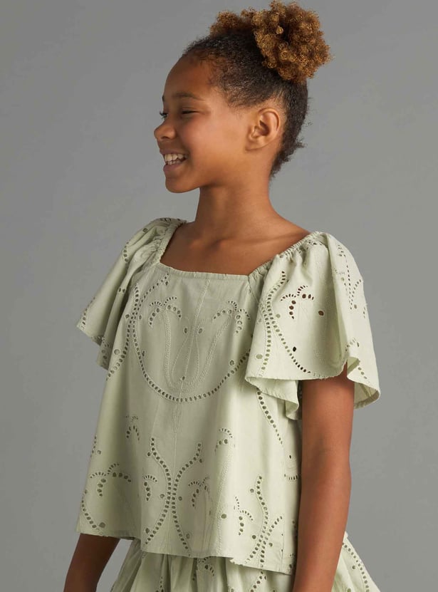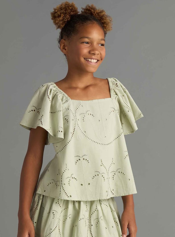 Delicate and charming, this schiffli embroidered top features a graceful square neck and flutter sleeves for a feminine touch. The intricate embroidery adds texture and elegance, perfect for elevating your everyday style.