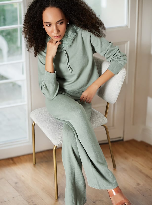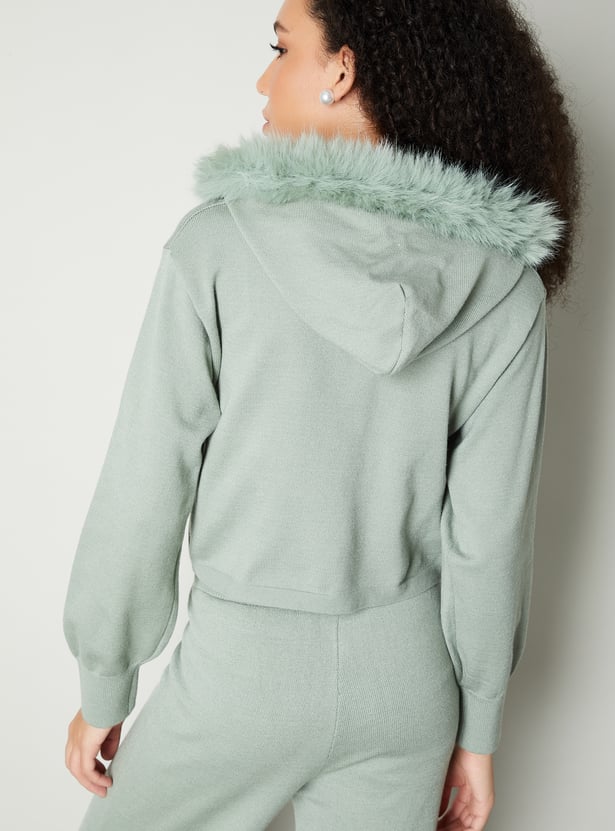 Stay warm and stylish with this fur-trim hooded sweater, perfect for chilly days. Featuring a drawcord hood and full sleeves, it combines cozy comfort with a touch of elegance.