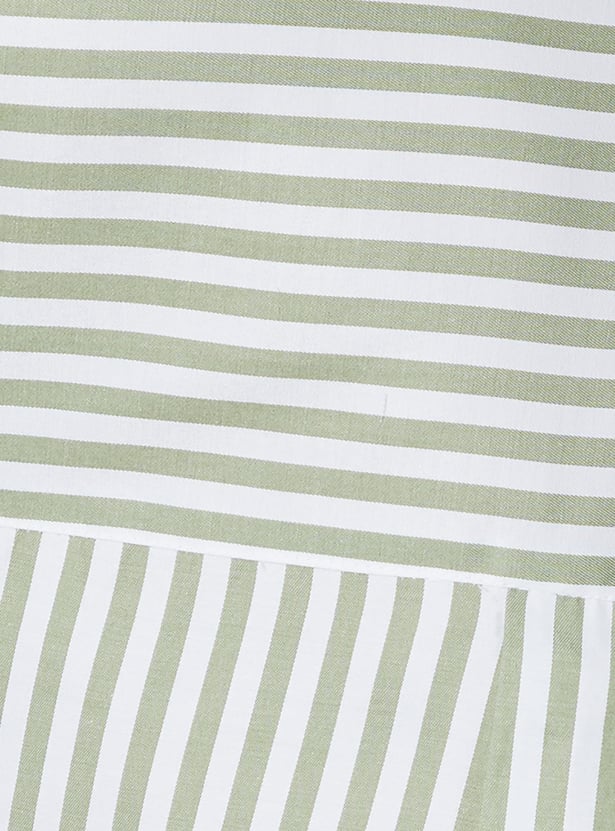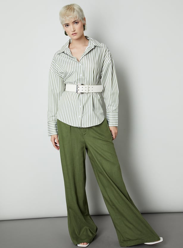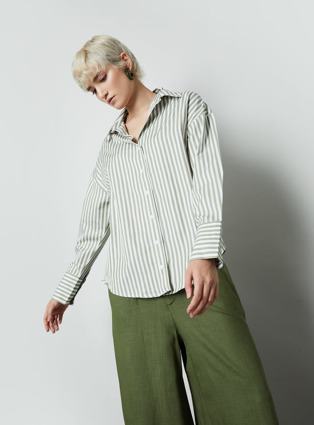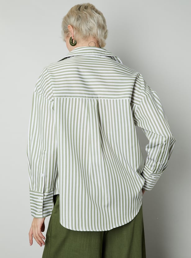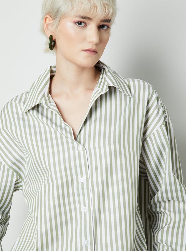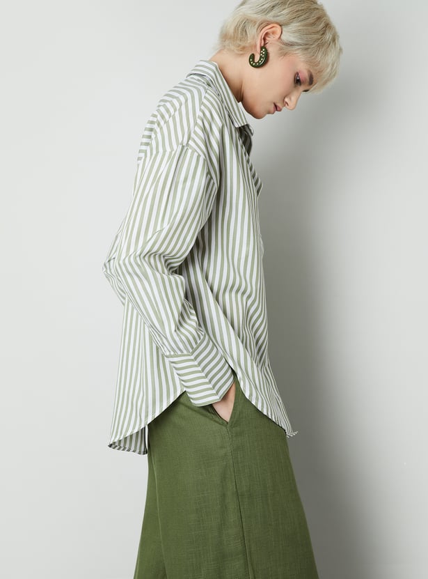 This oversized shirt features a spread collar, button placket, and full sleeves with button cuffs for a relaxed, effortless vibe. The bold stripes add a timeless touch to its easy silhouette.
