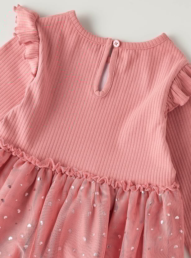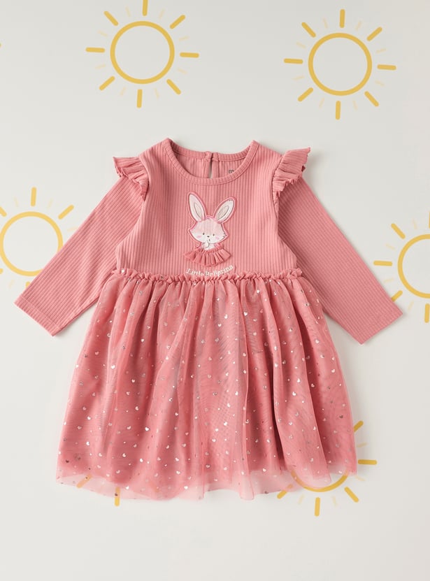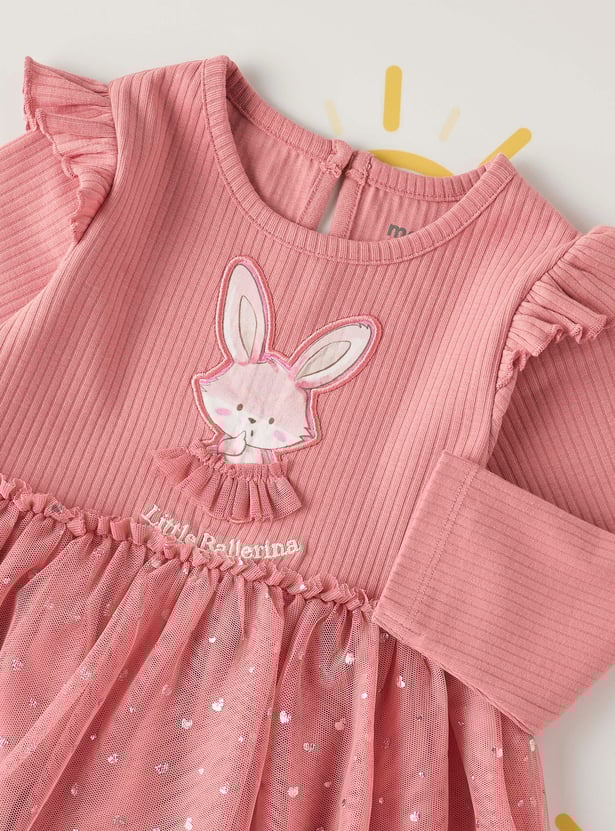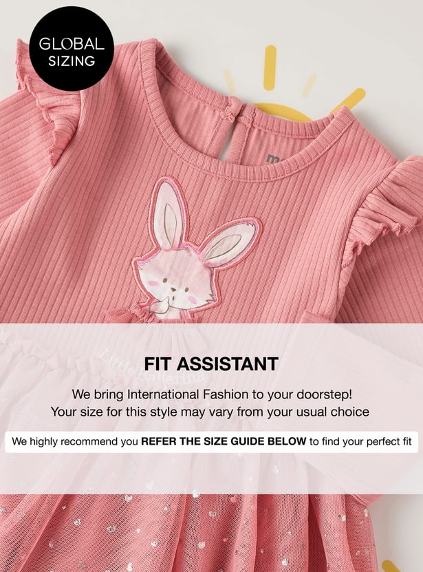 Delightfully charming, this dress features an adorable bunny applique on the front, adding a playful touch to her wardrobe. The round neck and long sleeves give a modest appeal, while the delicate ruffle detailing adds a sweet flair. Crafted from soft, comfortable fabric, this dress is as cosy as it is cute, offering both style and comfort for your little one.