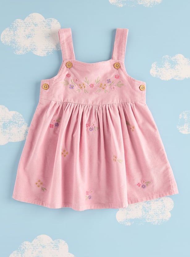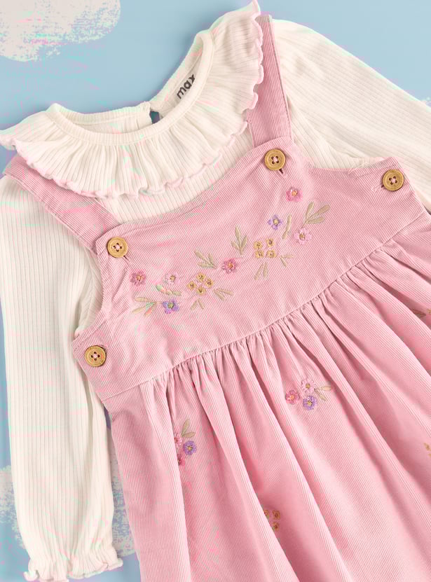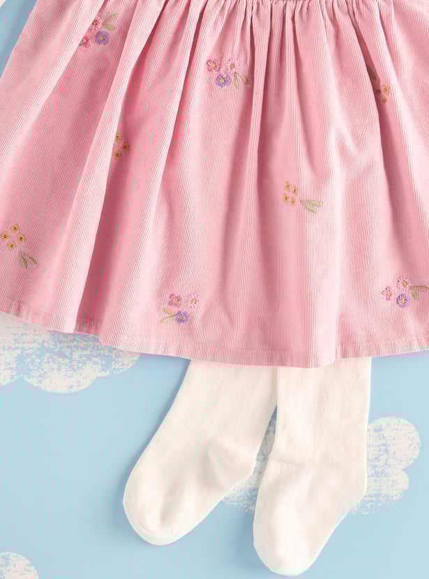 Dress your little angel in this captivating embroidered pinafore dress. This set includes a long-sleeved top with a round neckline and matching stockings. The top is adorned with intricate ribbed detailing, creating a delightful textural element. Designed for infants, this set offers a perfect blend of comfort and charm.
