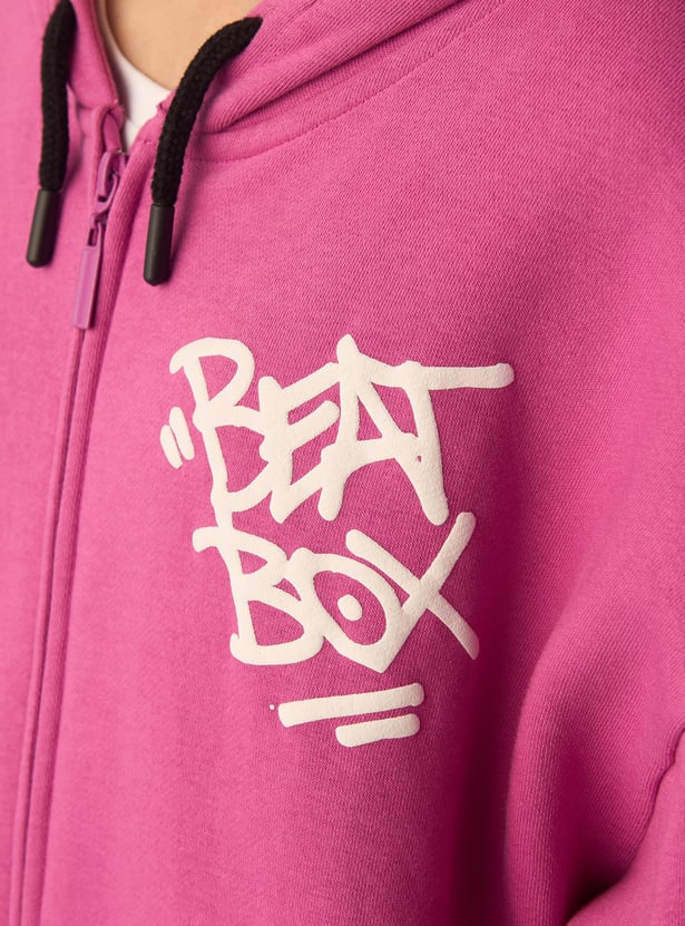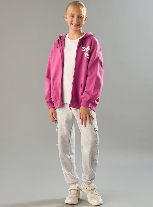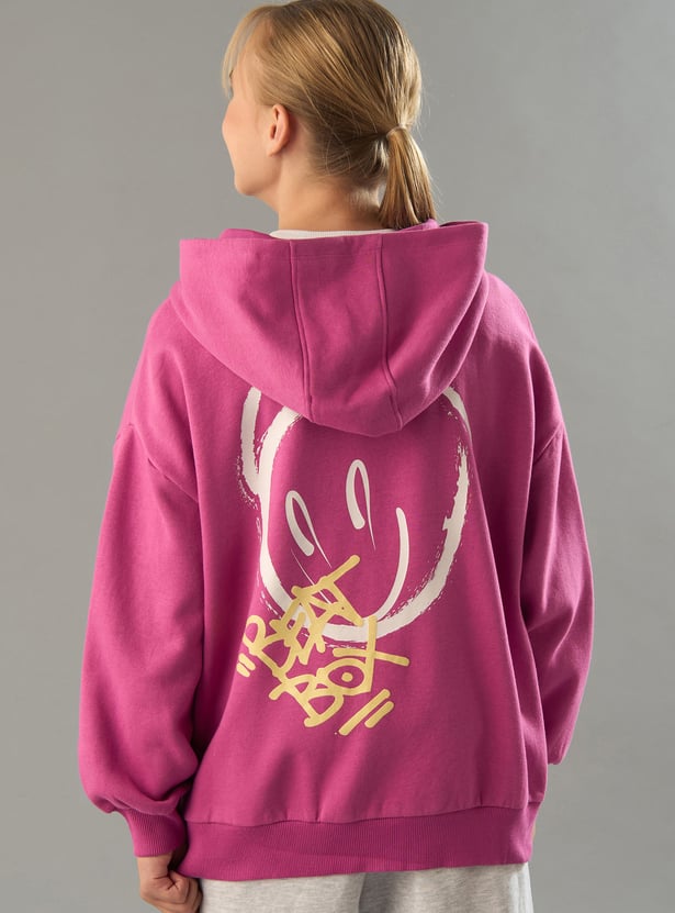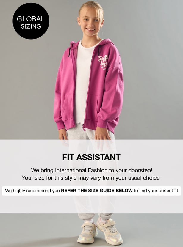 Let your daughter embrace a cosy and fashionable look with this oversized sweatshirt. Boasting a vibrant graphic print and a convenient pocket, it features a hooded neck, full sleeves, and a zip closure design. Perfect for casual outings or relaxed days at home, this sweatshirt combines style and comfort effortlessly.