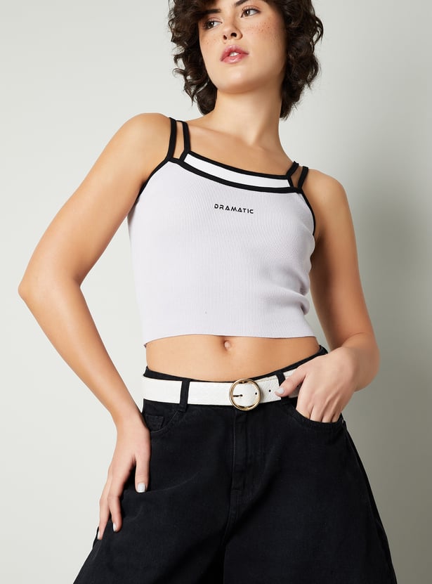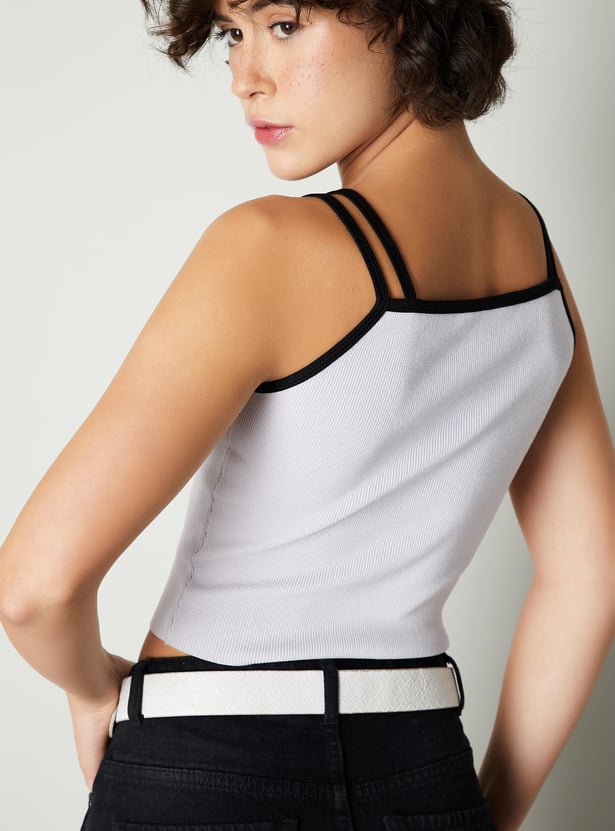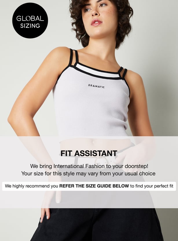 Embrace effortless style with this versatile top. Designed with a layered pattern and bold text detail in front, it adds a touch of individuality to your look. The slender spaghetti straps provide optimum support, while the ribbed finish and contrast piping enhance its visual appeal.