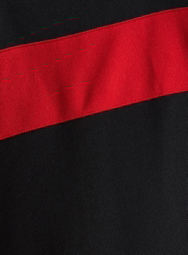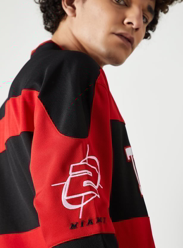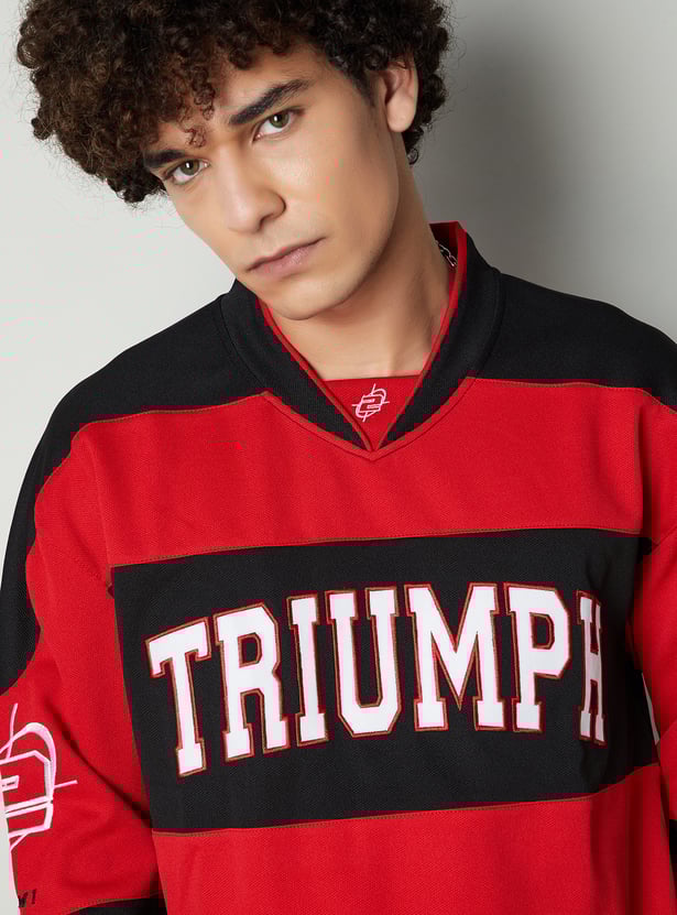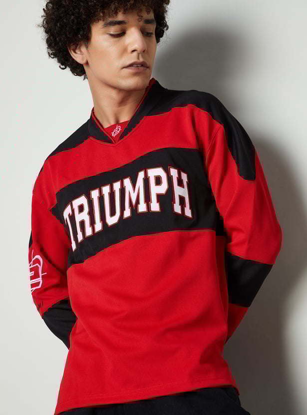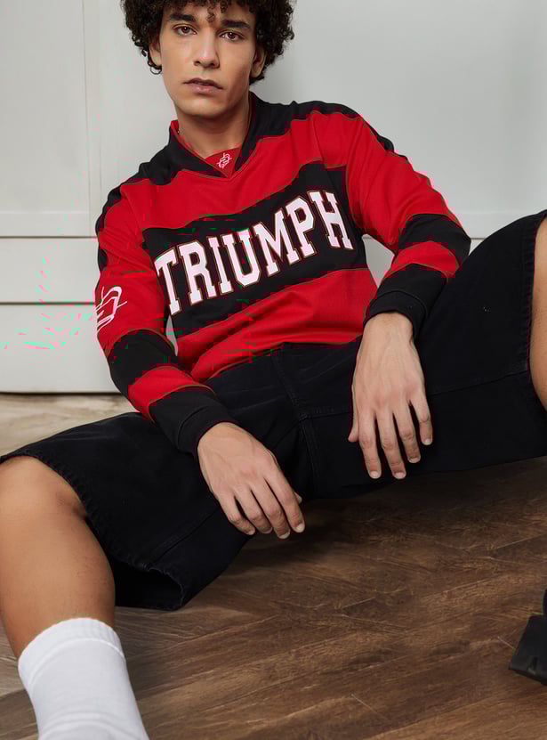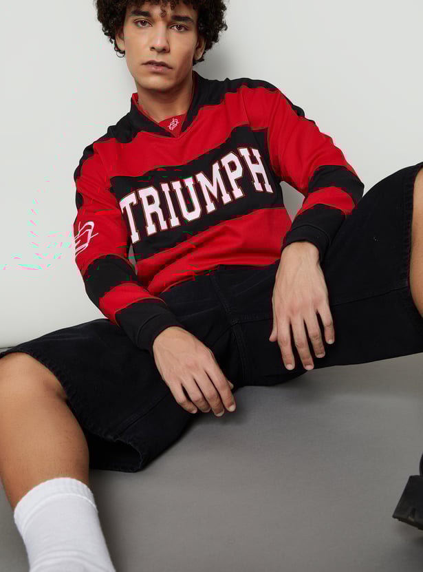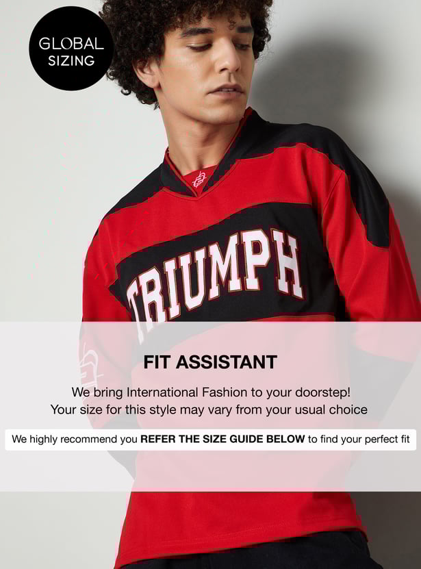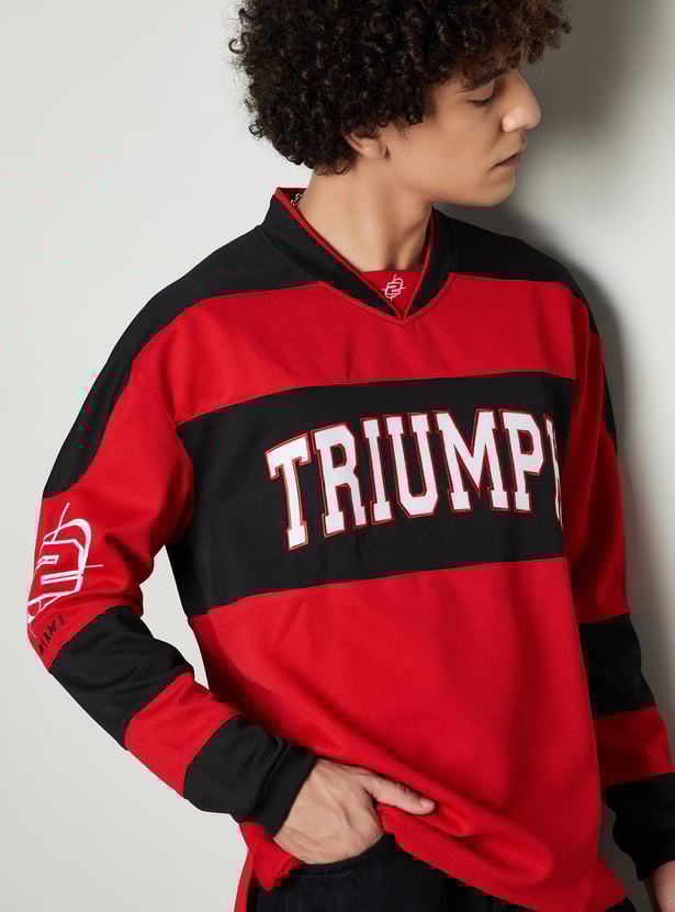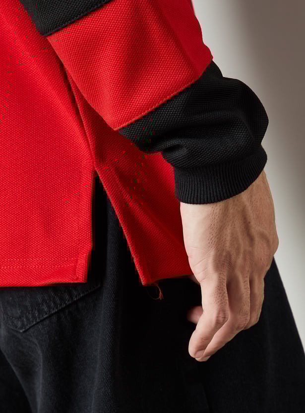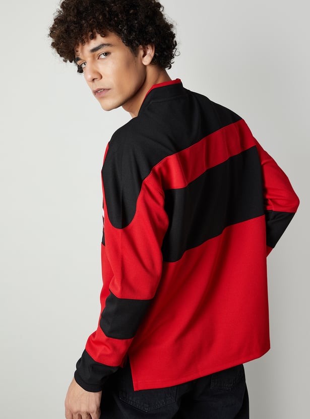 A juxtaposition of retro and bold makes this sweatshirt a piece to own this season. The baseball collar adds a striking look, while the full sleeves with ribbed cuffs ensure a snug fit and added comfort. The colourblock design and typography on the chest give a sporty vibe.
